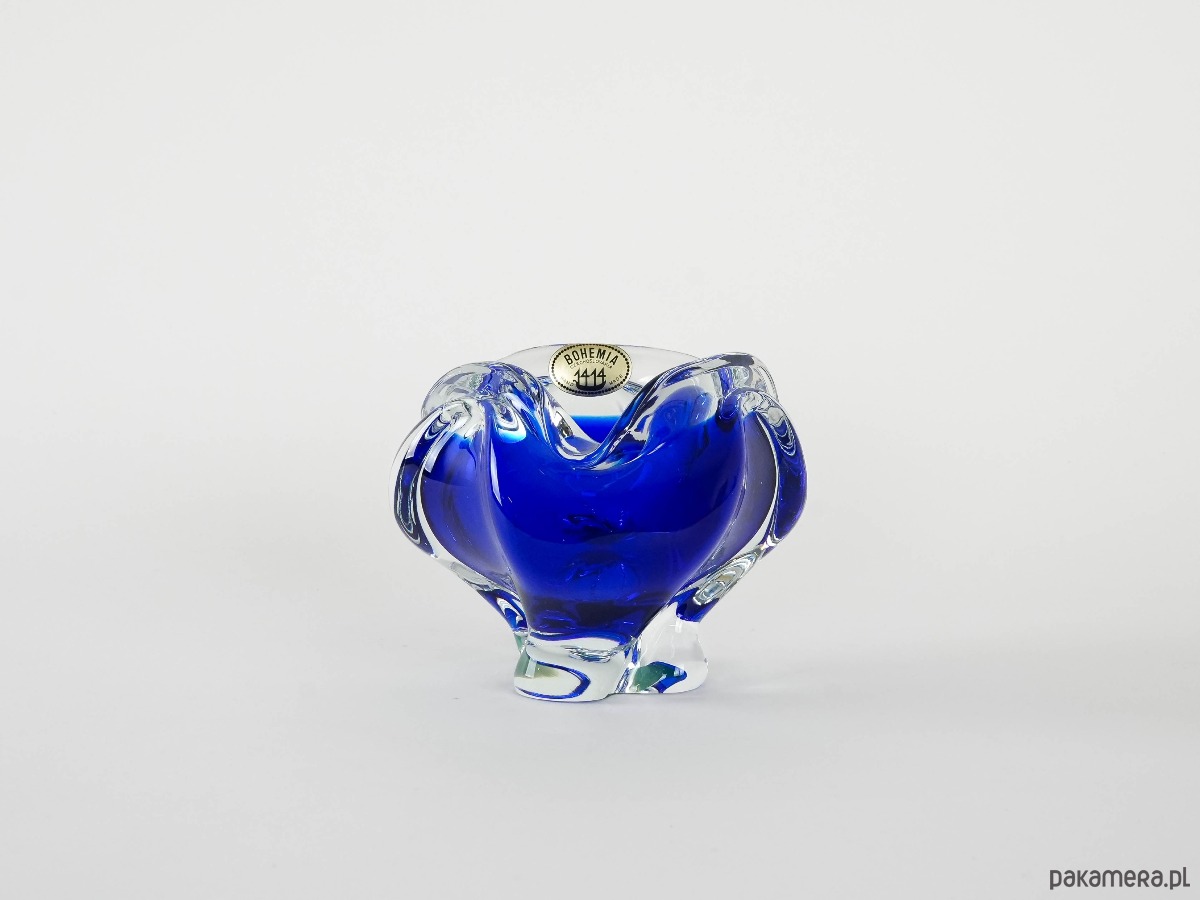 Zjawiskowa misa ze szkła kryształowego Bohemia w głębokim, kobaltowym odcieniu z subtelnym zielonym akcentem u podstawy. Ręcznie formowana, o organicznym, rzeźbiarskim kształcie, stanowi doskonały przykład czeskiego szkła artystycznego z epoki mid-century. Gra światła w przejrzystych i barwnych partiach tworzy efekt trójwymiarowej głębi, dzięki czemu misa wygląda jak zamrożona fala koloru. Może pełnić funkcję dekoracyjną, jak i użytkową – na drobiazgi, owoce lub jako solowy akcent kolekcjonerski. Ikoniczny przykład czeskiego designu szkła Bohemia – ekspresyjny, elegancki i ponadczasowy.