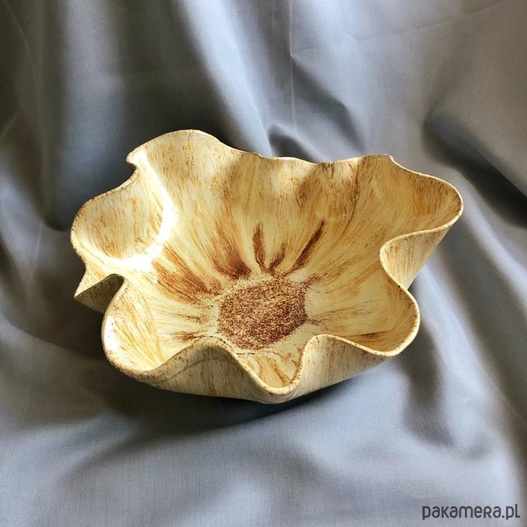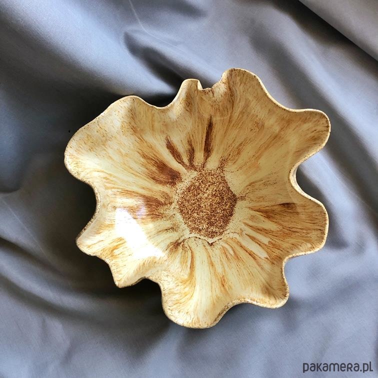 Ręcznie robiona, unikatowa misa ceramiczna. Posiada nieregularne pofalowane brzegi, przypominając od góry kwiat.