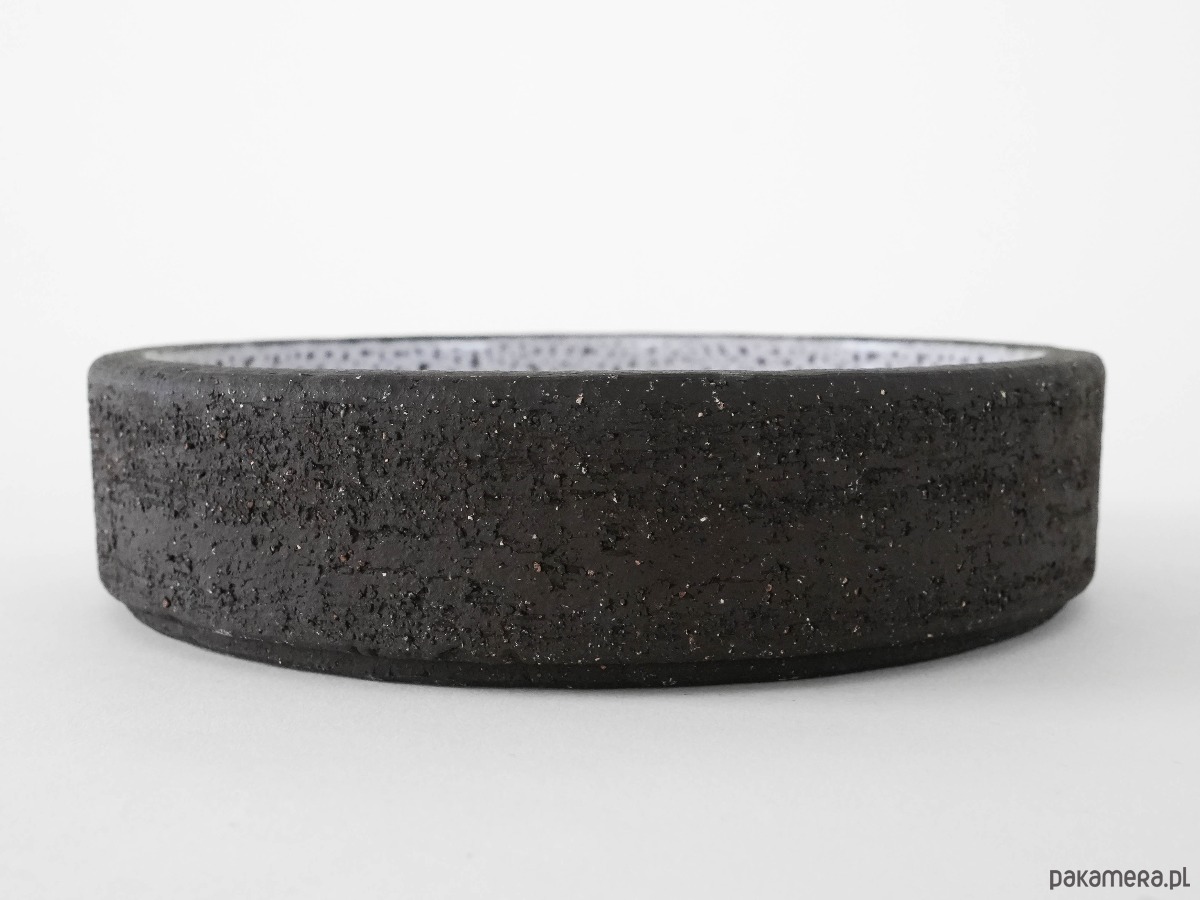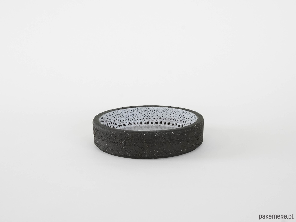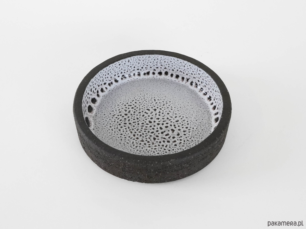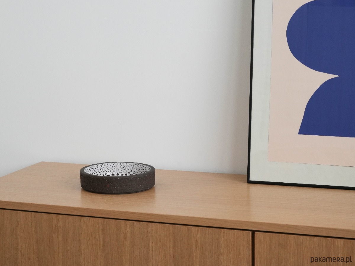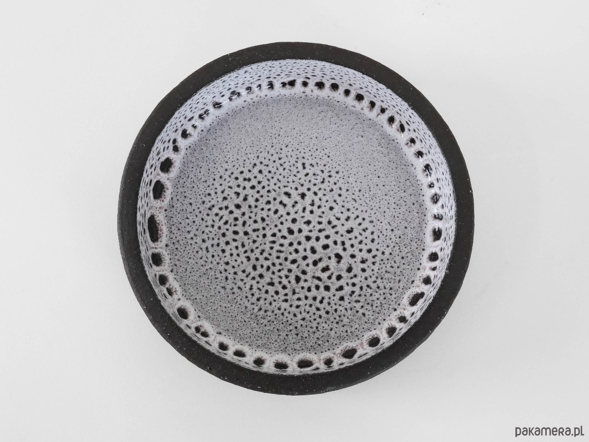Utrzymana w odcieniach szarości i bieli, z charakterystycznym kontrastowym szkliwieniem wewnątrz, tworzącym dekoracyjny, kropkowany efekt. Prosta, geometryczna forma podkreśla minimalistyczny charakter naczynia, doskonałego zarówno jako element użytkowy, jak i dekoracyjny.