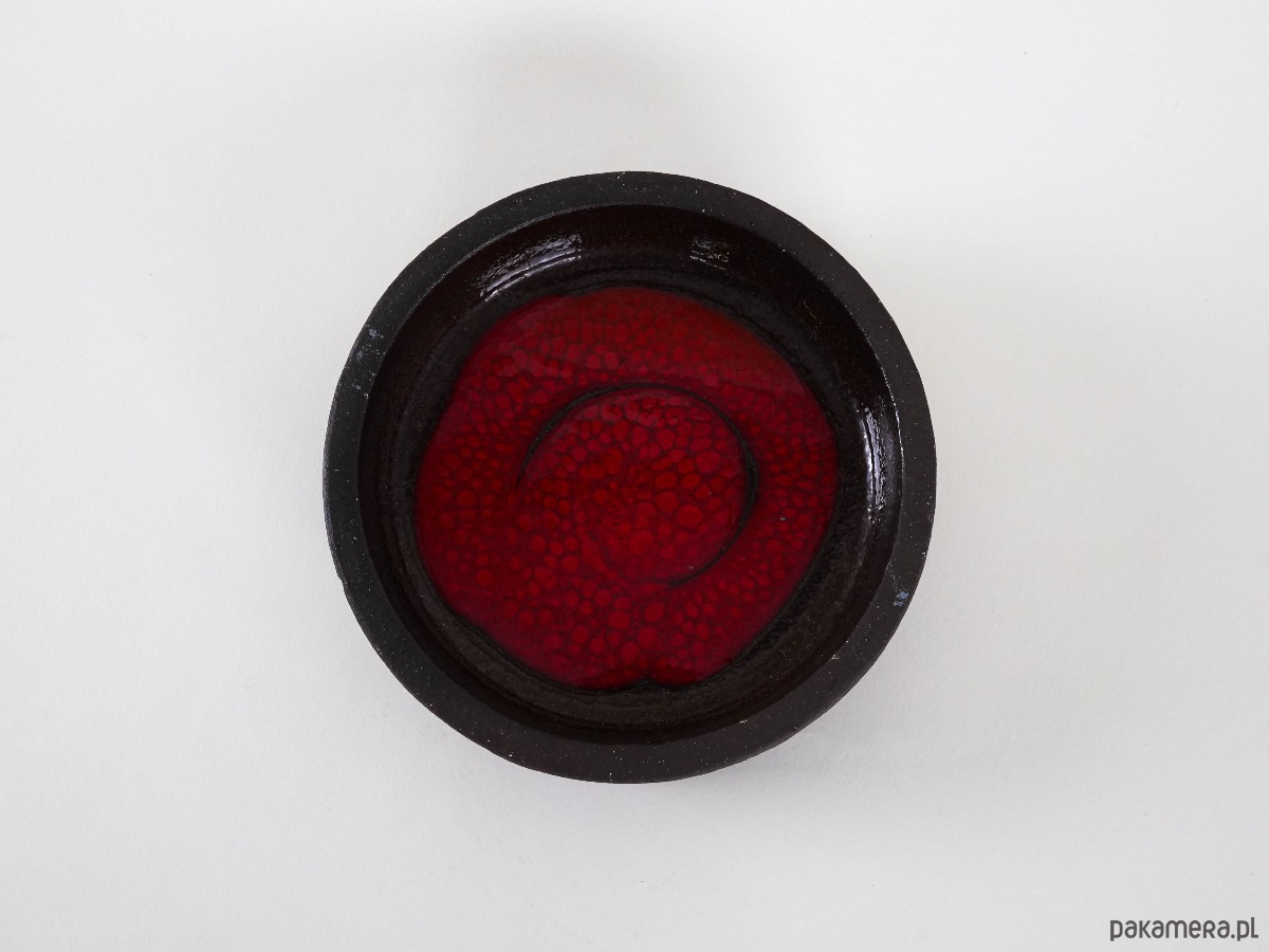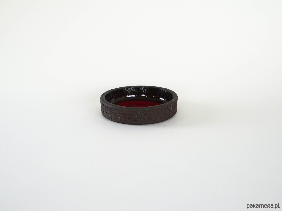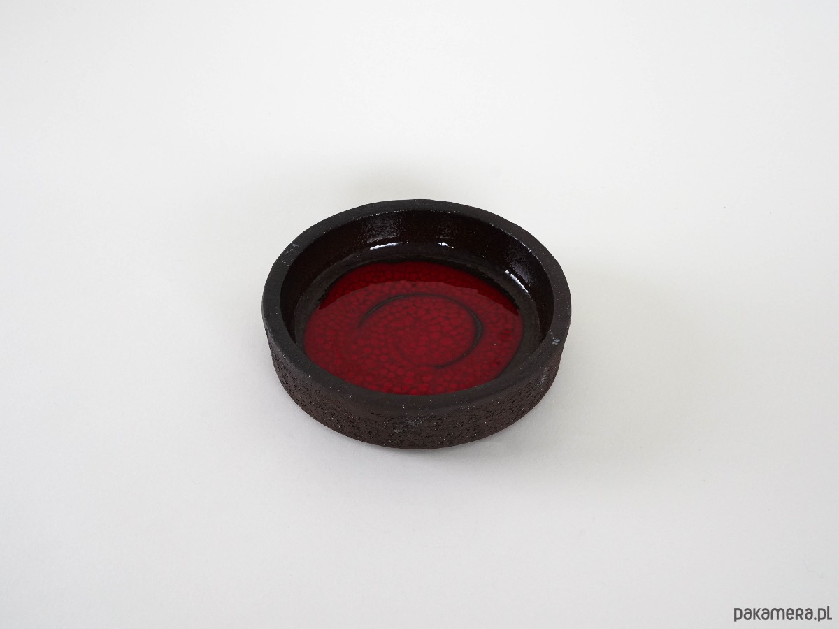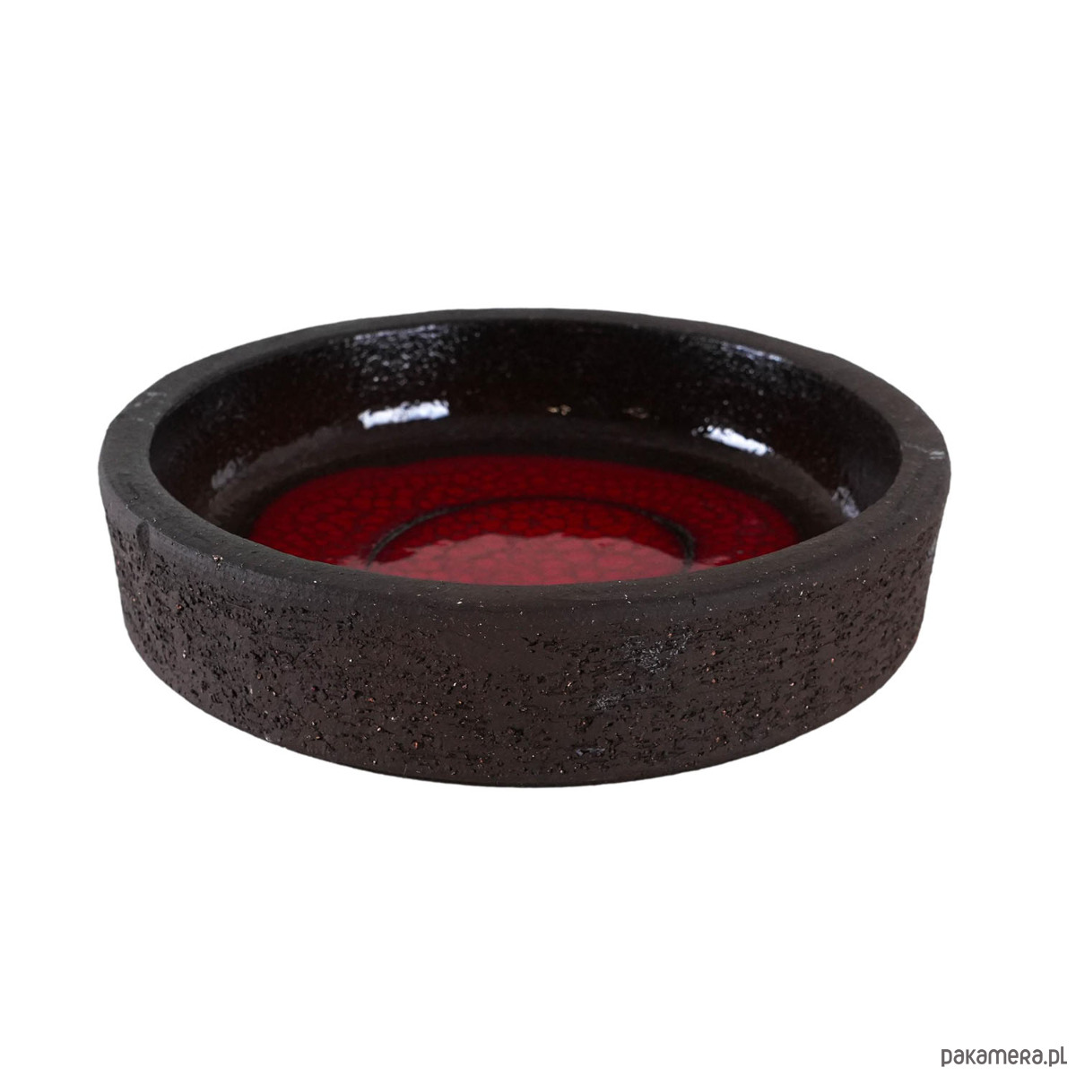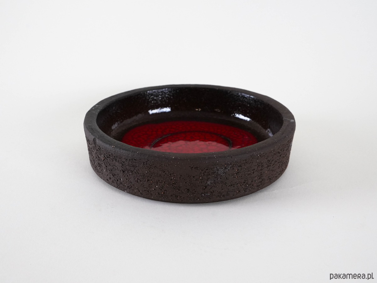 Ceramiczna misa projektu Lehmann – wykonana z grubej, szorstkiej brązowej gliny, której surowość pięknie kontrastuje z intensywnie czerwonym szkliwieniem wewnątrz. Charakterystyczna faktura i głębia koloru nadają jej wyraz artystyczny i kolekcjonerski, typowy dla najlepszych europejskich projektów ceramiki z połowy XX wieku. Doskonała jako misa dekoracyjna, designerski akcent w nowoczesnym wnętrzu lub element kolekcji vintage.