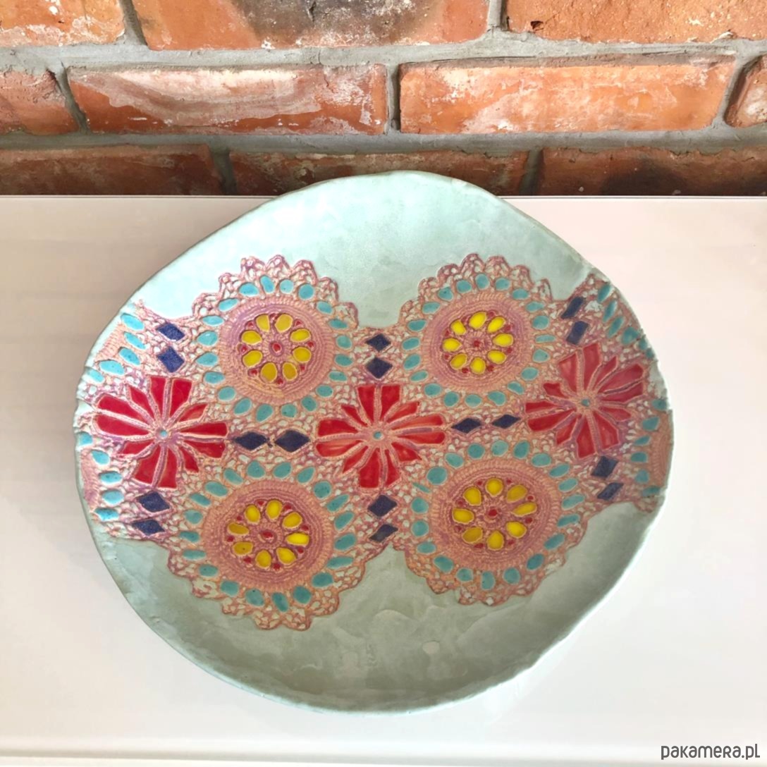 Duży ceramiczna misa ozdobna z kwiatową koronką w optymistycznych pastelowych barwach.