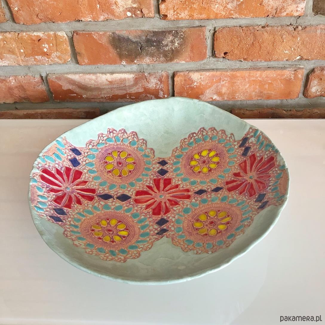 Duży ceramiczna misa ozdobna z kwiatową koronką w optymistycznych pastelowych barwach.