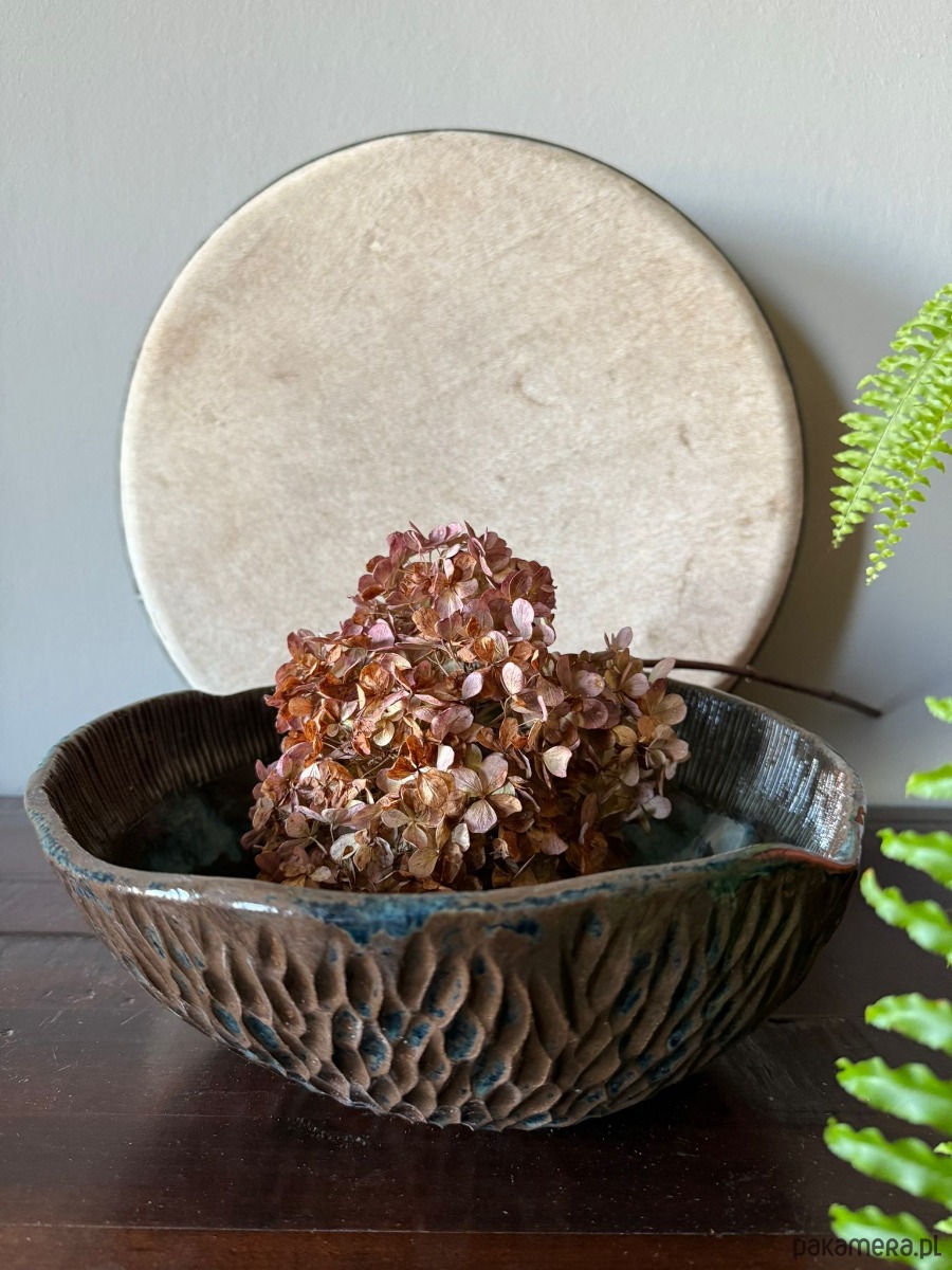 Na zewnątrz misa została rzeźbiona, co podkreśla jej artystyczny styl i rękodzielniczy charakter. Rzeźbiony jest także rant wewnątrz naczynia – około 4 cm szerokości pas ozdobny dodaje całości elegancji i wyjątkowości.
