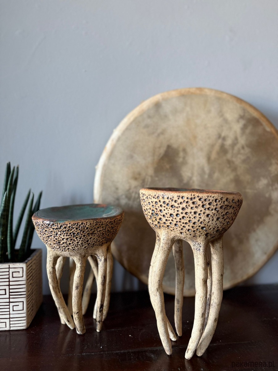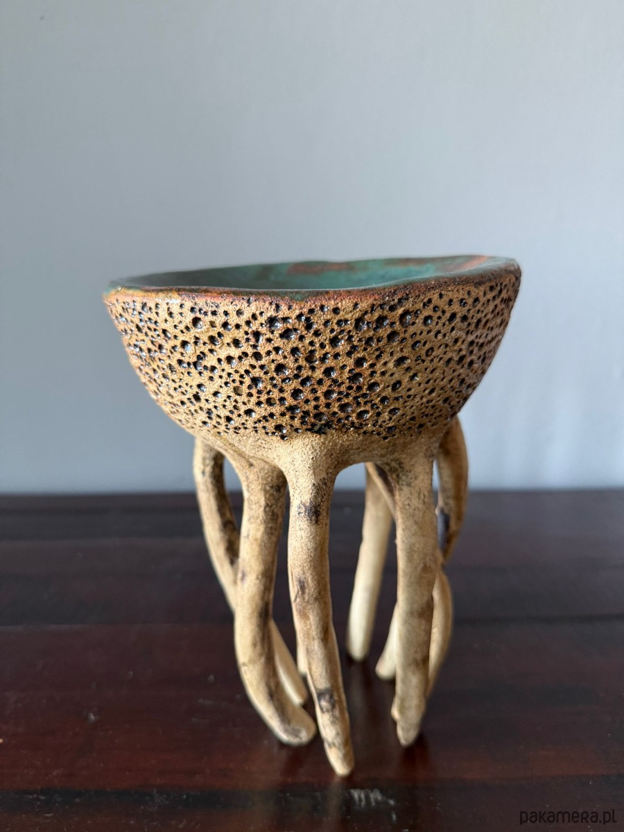 Może pełnić rolę dekoracji, a także subtelnej podstawki na biżuterię, świece czy drobne przedmioty. Zewnętrzna powierzchnia zachwyca strukturą gliny podkreśloną szkliwem w odcieniu starego złota i delikatną warstwą transparentnego szkliwa. Wnętrze miski zdobi błyszczące szkliwo w odcieniach zieleni i brązu, tworząc efekt głębi i naturalnego krajobrazu.