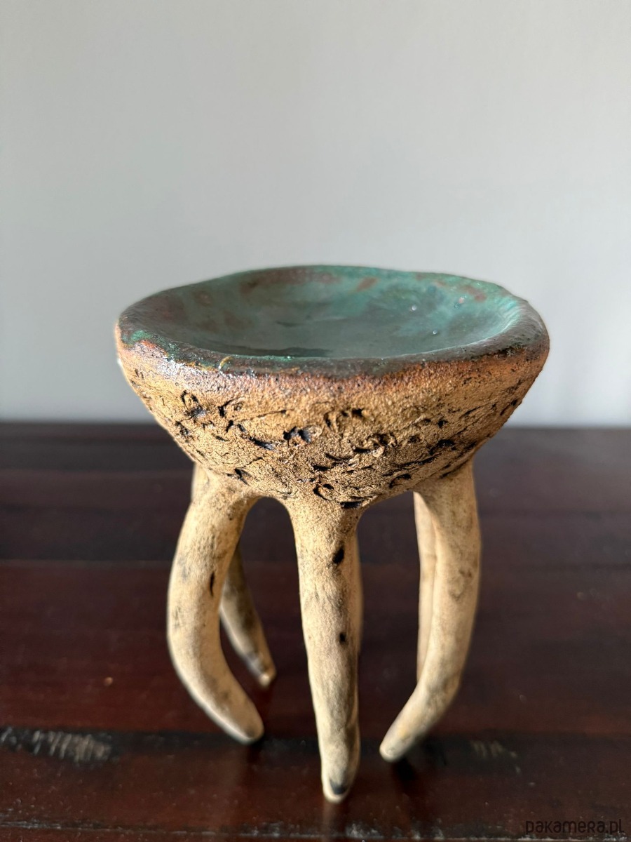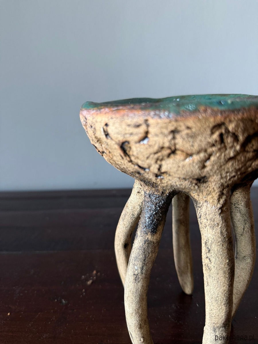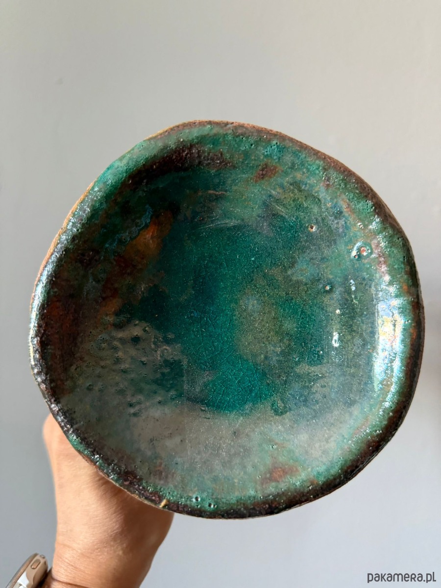 Jej zewnętrzna powierzchnia ma wyraźną strukturę gliny, delikatnie podkreśloną szkliwem w odcieniu starego złota i cienką, transparentną warstwą nadającą subtelny połysk. Wnętrze wypełnia błyszczące szkliwo w tonacjach zieleni i brązów, tworząc efekt przypominający grę światła w morskiej głębinie.