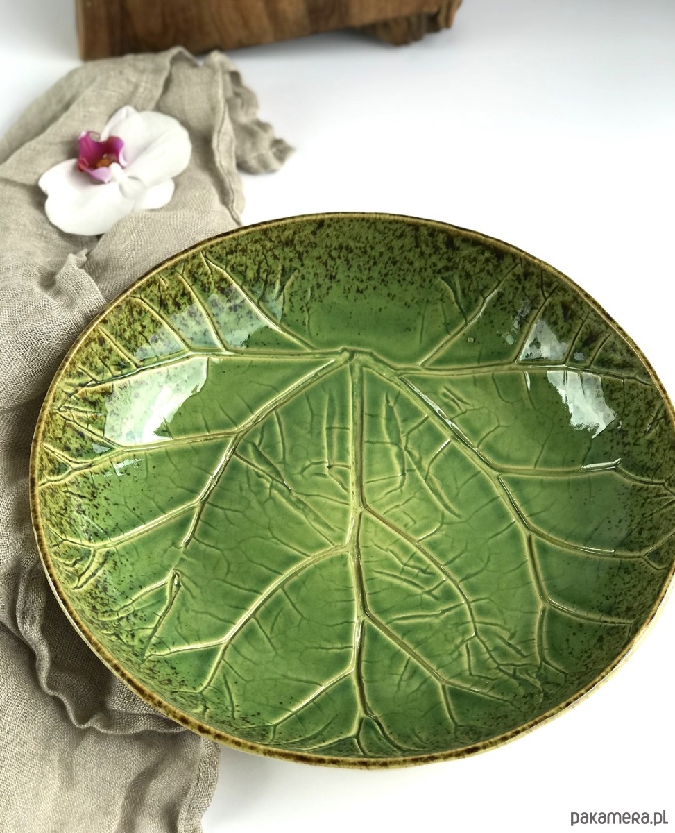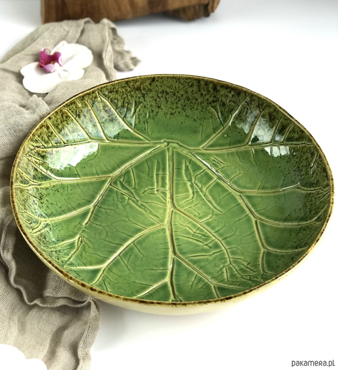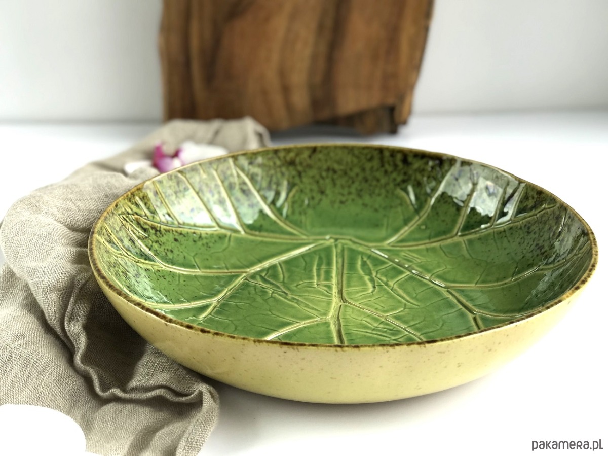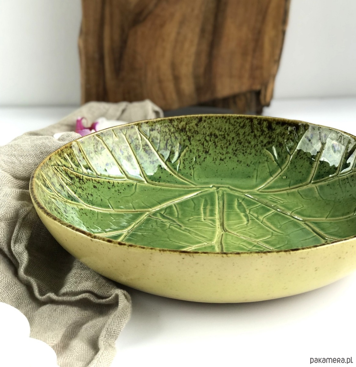 Ręcznie formowana misa ceramiczna pokryta jest szkliwami spożywczymi w odcieniach zieleni i jasnej zieleni brązu na obrzeżach.