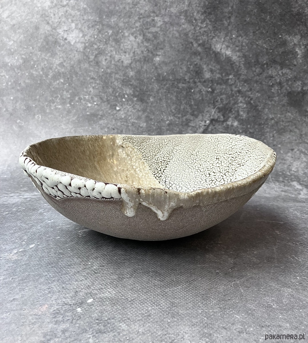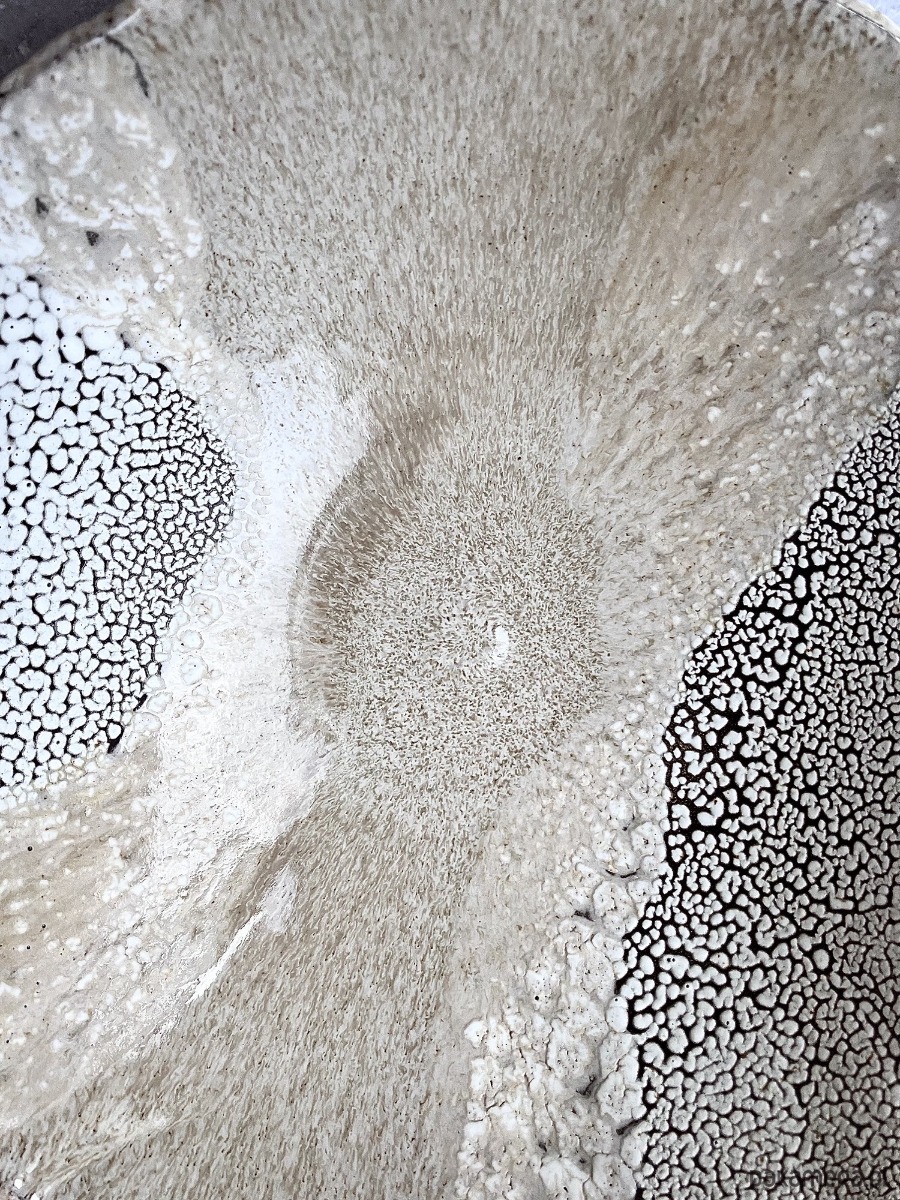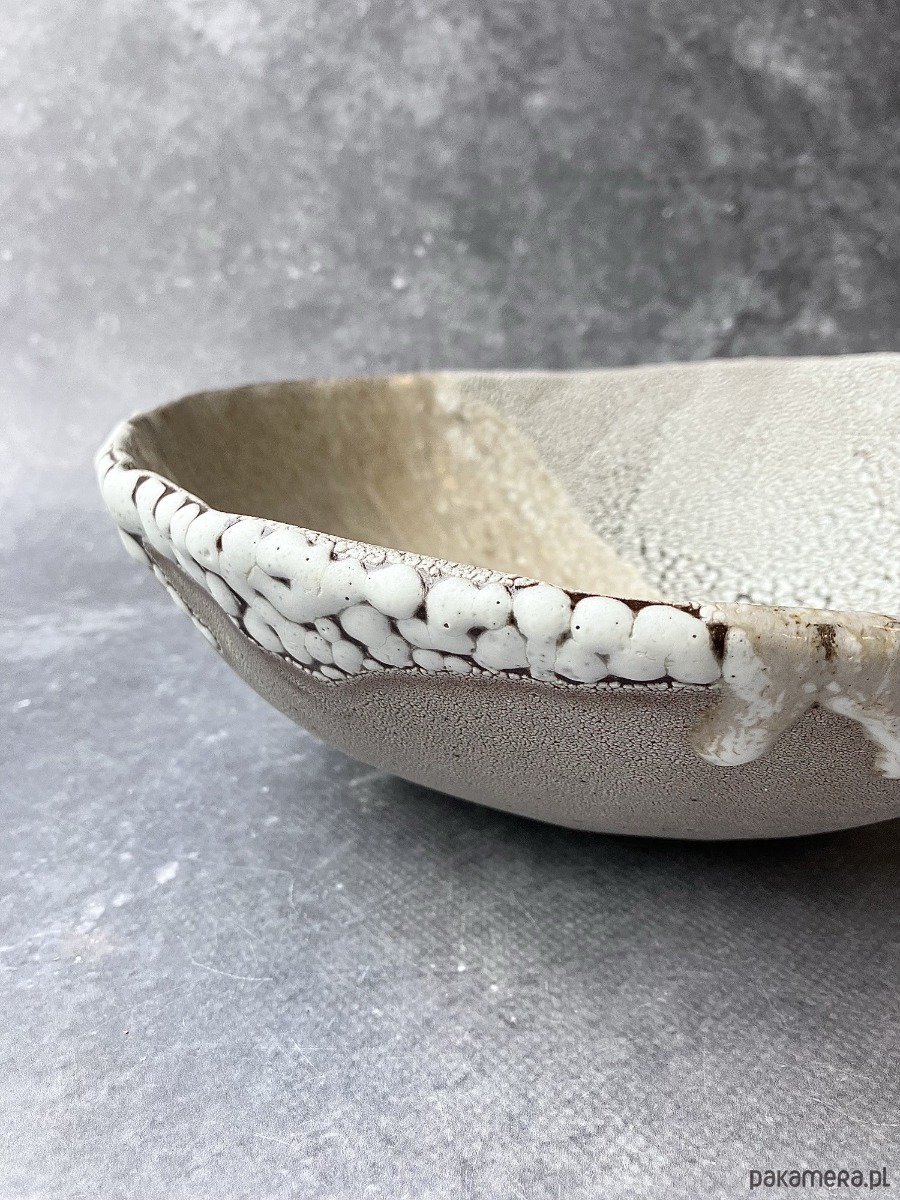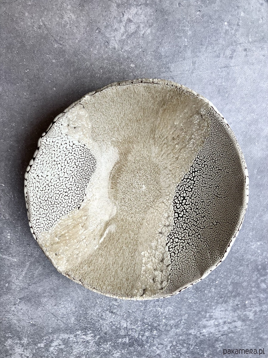 DEEP INTO THE SEA to autorska seria ceramiczna inspirowana ciszą, ciężarem i tajemnicą głębin. Każdy obiekt przypomina fragment podwodnego świata wydobyty na powierzchnię- jakby zastygły ślad procesów, które zachodzą daleko od światła, pod wpływem czasu, ciśnienia i powolnego ruchu materii. Powierzchnie naczyń są gęste, organiczne, pełne mikropęknięć, porów i struktur przywodzących na myśl rafy koralowe, wapienne osady, muszle i skalne dno morza. Kontrast między jasnymi, kredowymi obszarami a ciemniejszą, spękaną siatką tworzy wrażenie mapy nieznanego terenu- topografii głębin. Glazura zachowuje się jak osad mineralny: narasta, cofa się, odsłania warstwy, sugerując naturalne procesy erozji i krystalizacji.