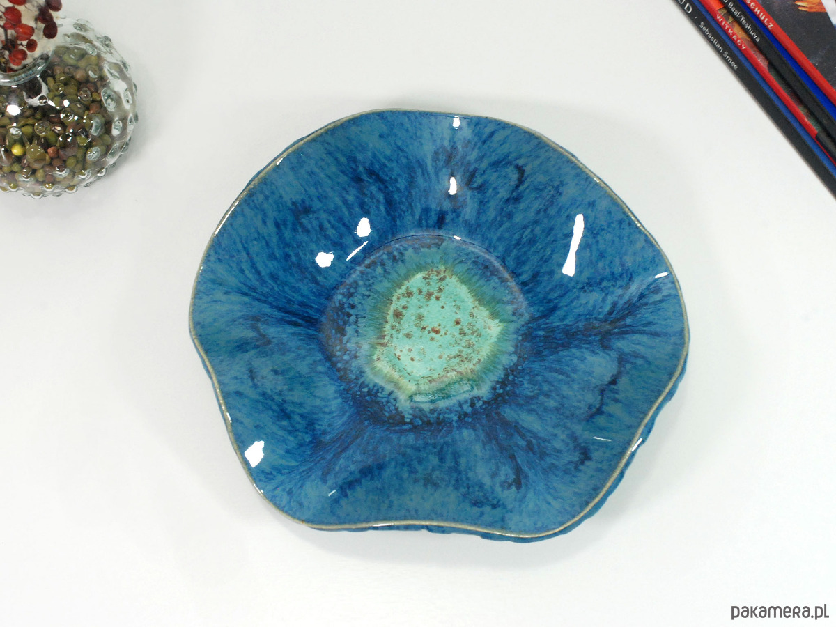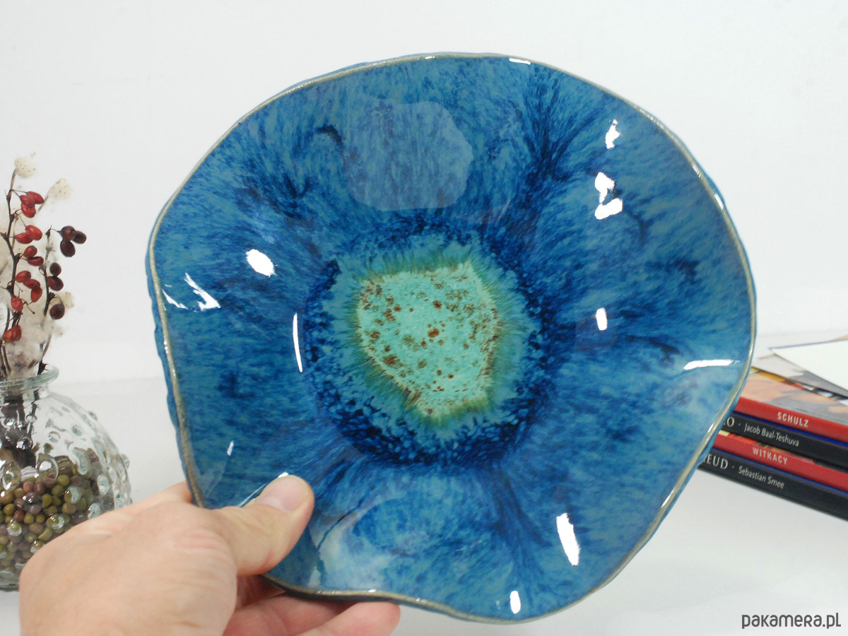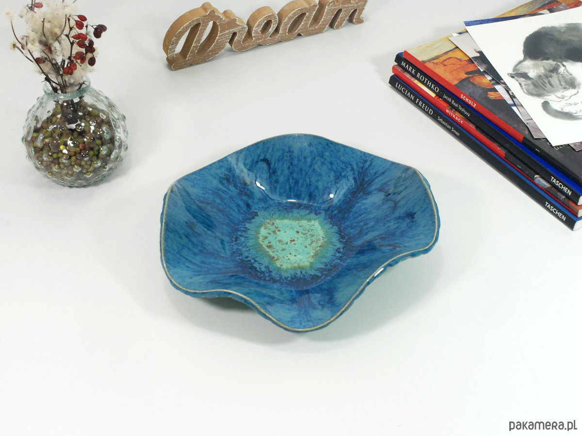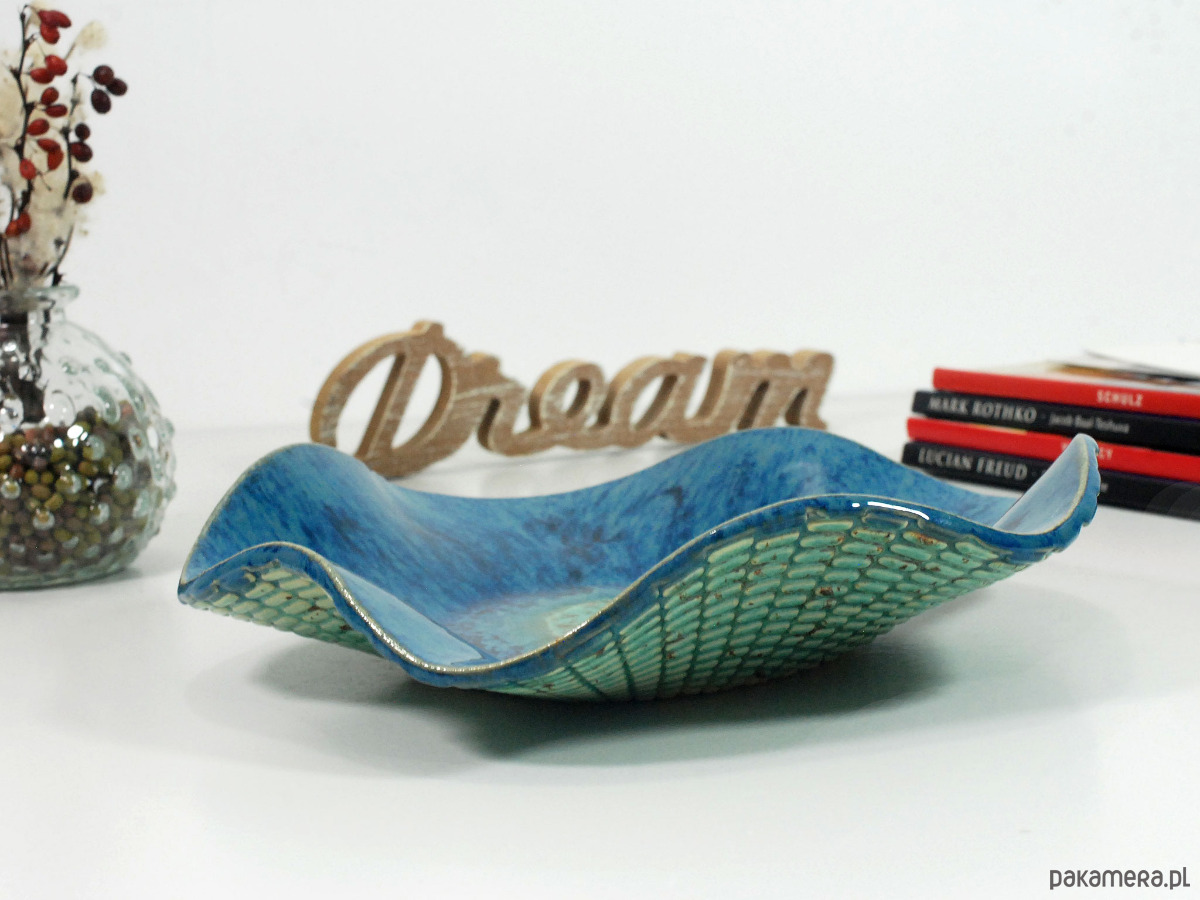 Ręcznie robiona i malowana ceramiczna misa laguna - możesz ją wykorzystać jako element dekoracji swojego salonu, łazienki czy sypialni. Świetnie sprawdzi się do serwowania owoców, sałatek, drobnych przekąsek czy słodkości lub jako pojemnik na biżuterię, kosmetyki, perfumy i drobne akcesoria.