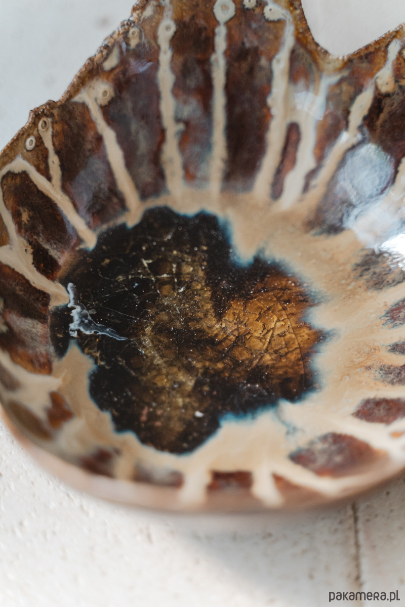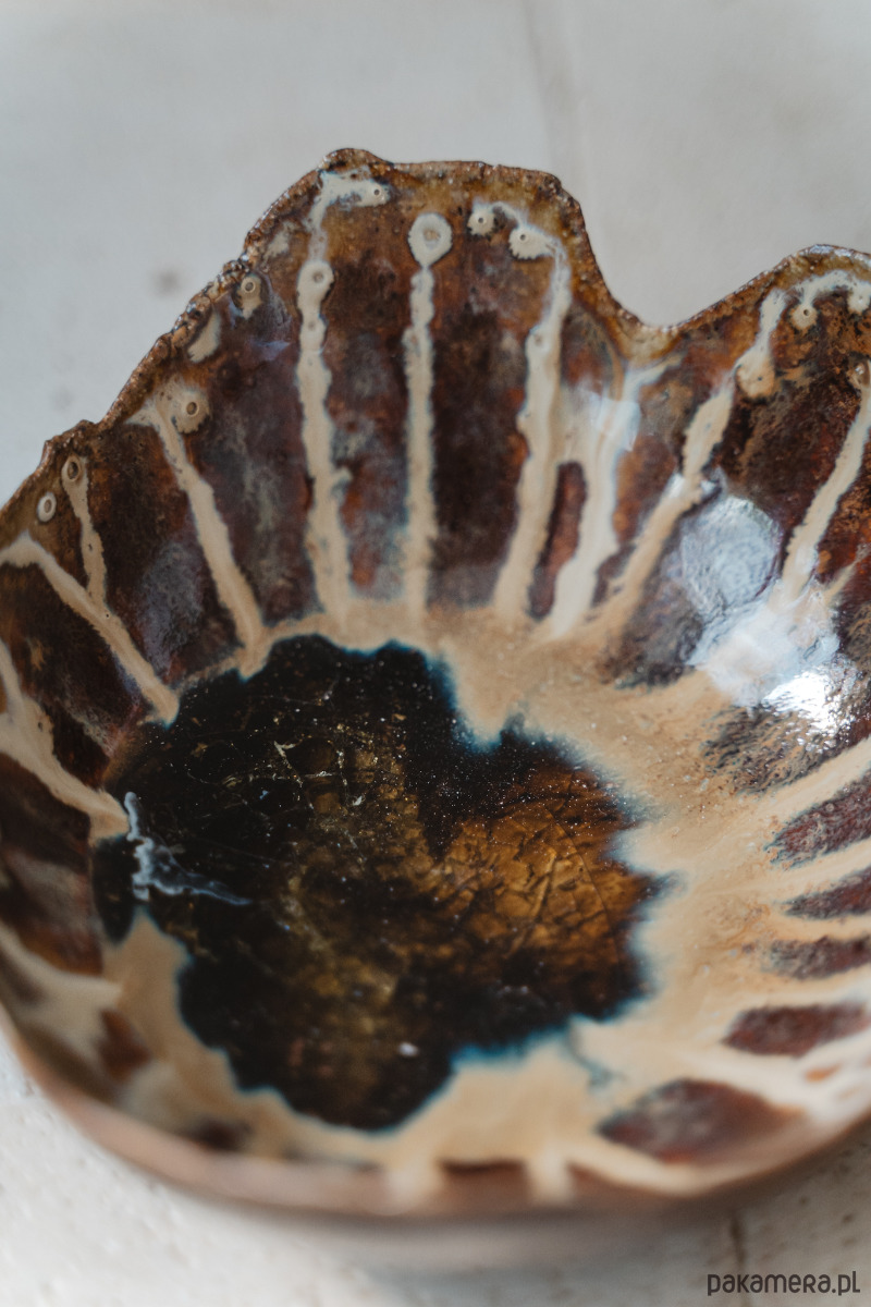 Ceramiczna miska ozdobna wykonana ręcznie z jasnej gliny, pokryta szkłem i błyszczącymi szkliwami.
