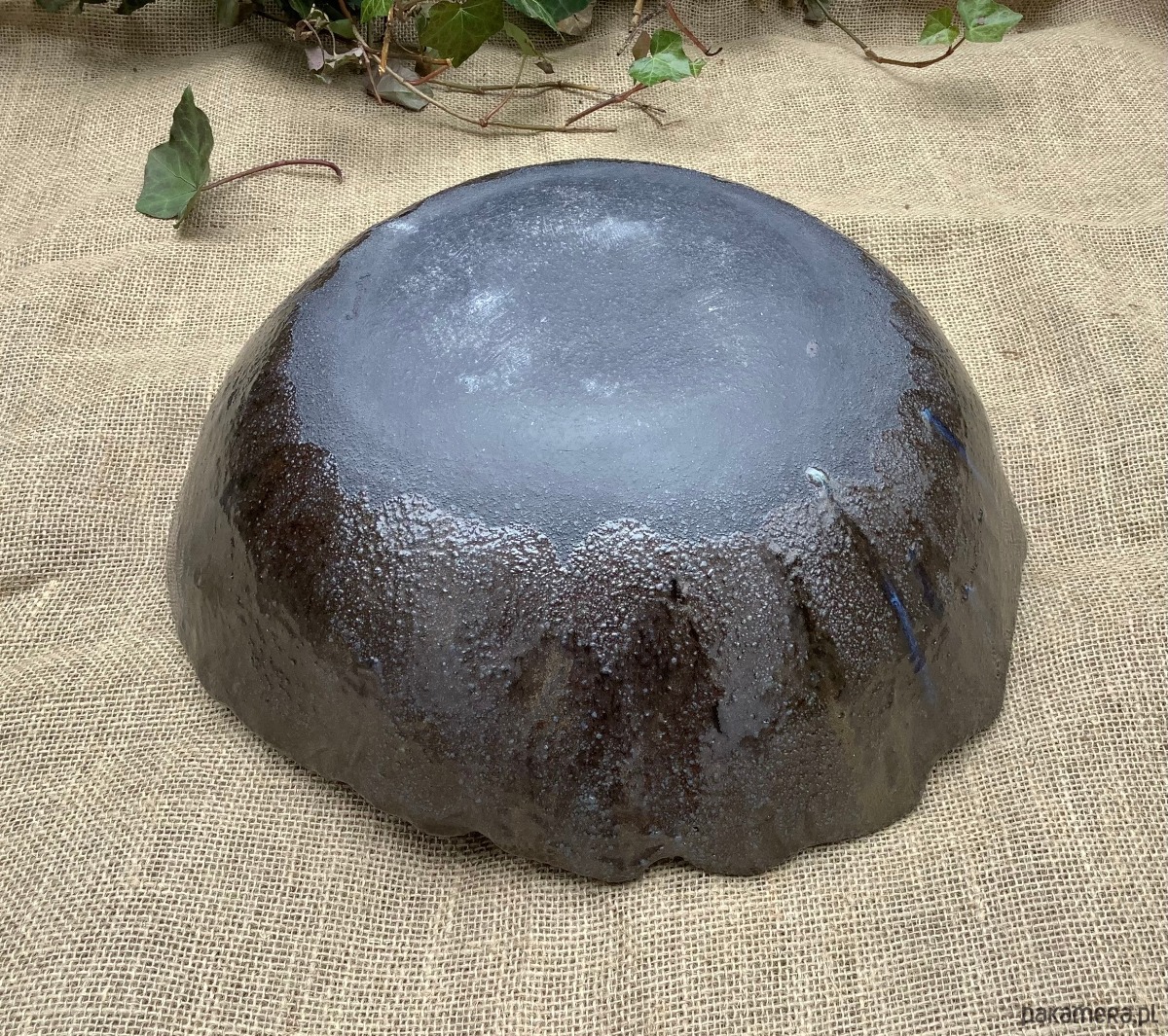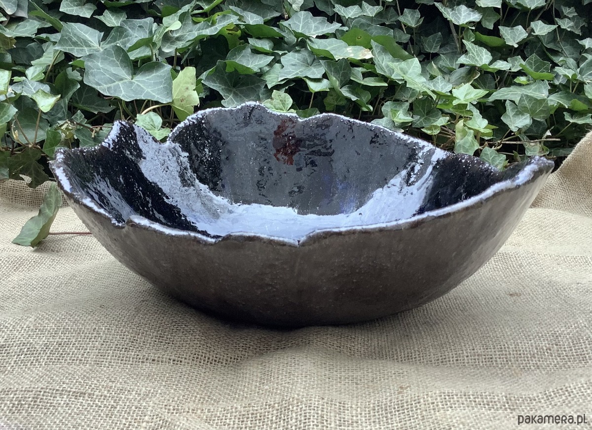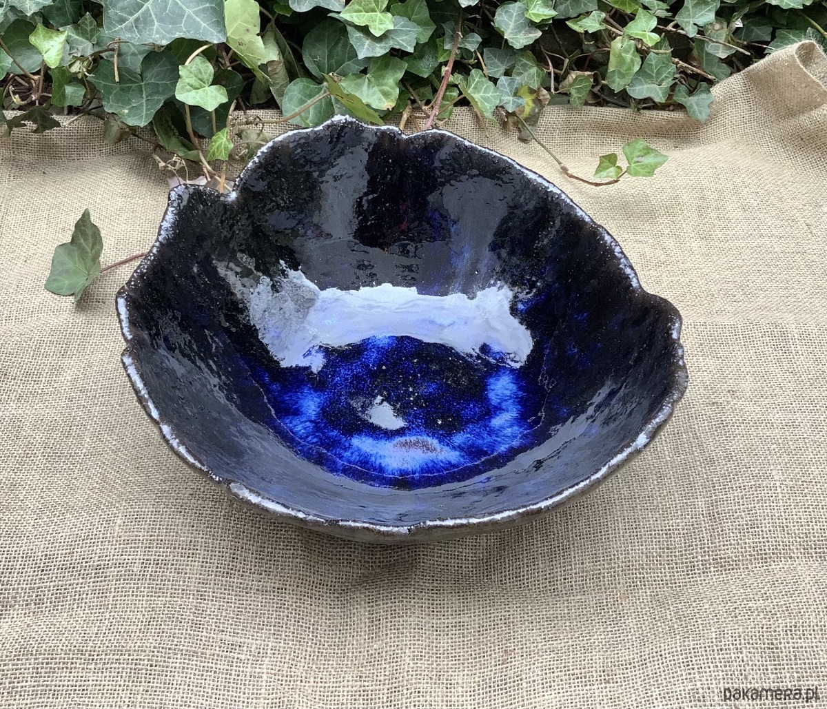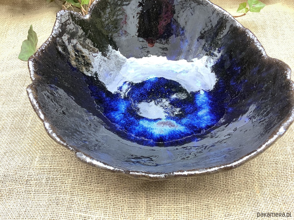 Zapraszam do zakupu misy wykonanej ręcznie z ciemnej glliny. W środku i na rantach została poszkliwiona efektowym szkliwem w kolorze niebieskim, które spływając podczas wypału, utworzyło na dnie niebieską plamę, a na ścionkach pozostało w ciemnych prześwitach. Na zewnątrz misa jest poszkliwiona satynowym szkliwem w kolorze starego złota/brązu. Ma nieregularne brzegi i kształt. Wypalona na 1240 stopni.