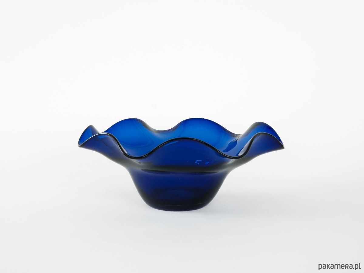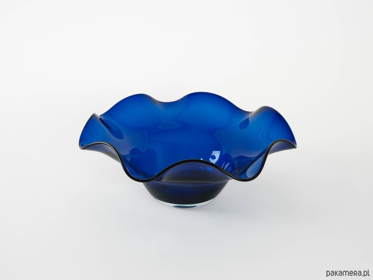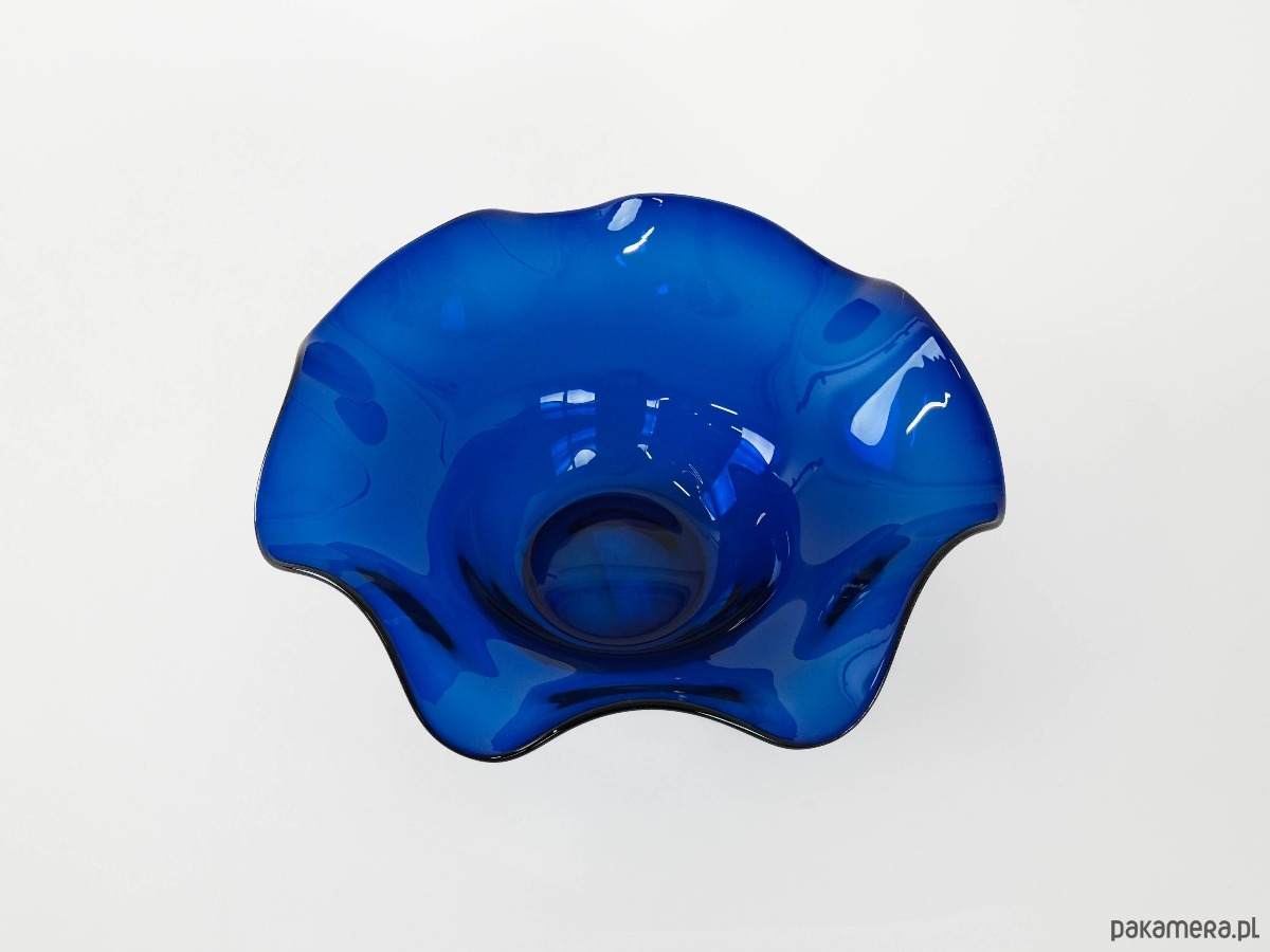 Elegancka, ręcznie formowana misa w intensywnym kobaltowym odcieniu szkła. Charakterystyczna pofalowana krawędź nadaje jej lekkości i dekoracyjnego charakteru, a nasycony kolor pięknie załamuje światło, tworząc wyjątkowy efekt wizualny. Idealna jako dekoracja stołu, patera na owoce lub stylowy akcent w kolekcji szkła artystycznego.