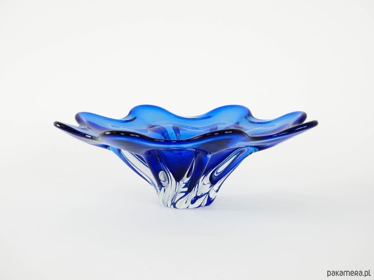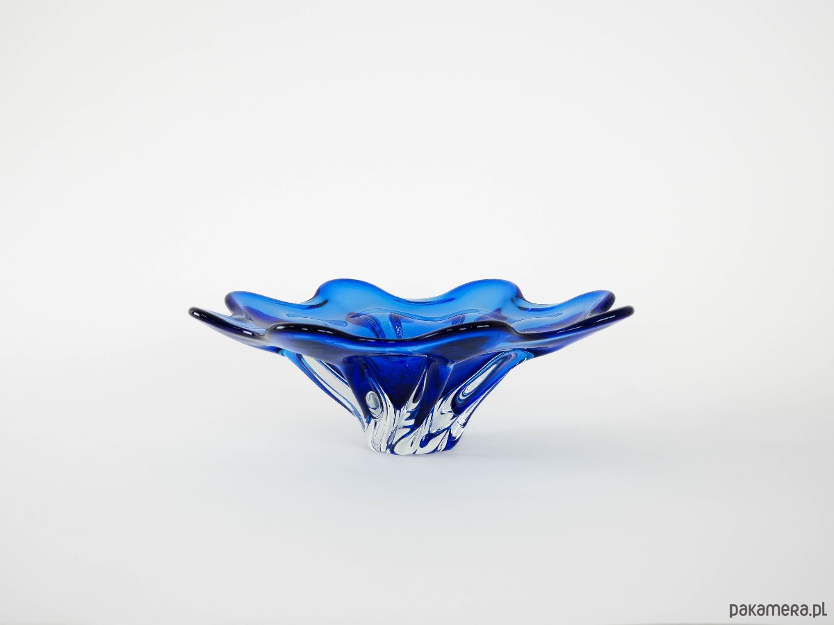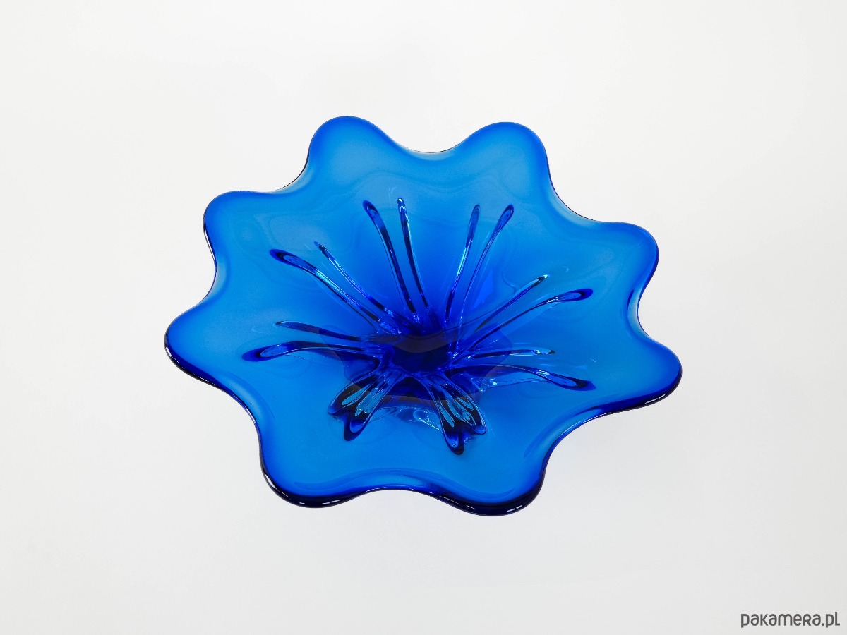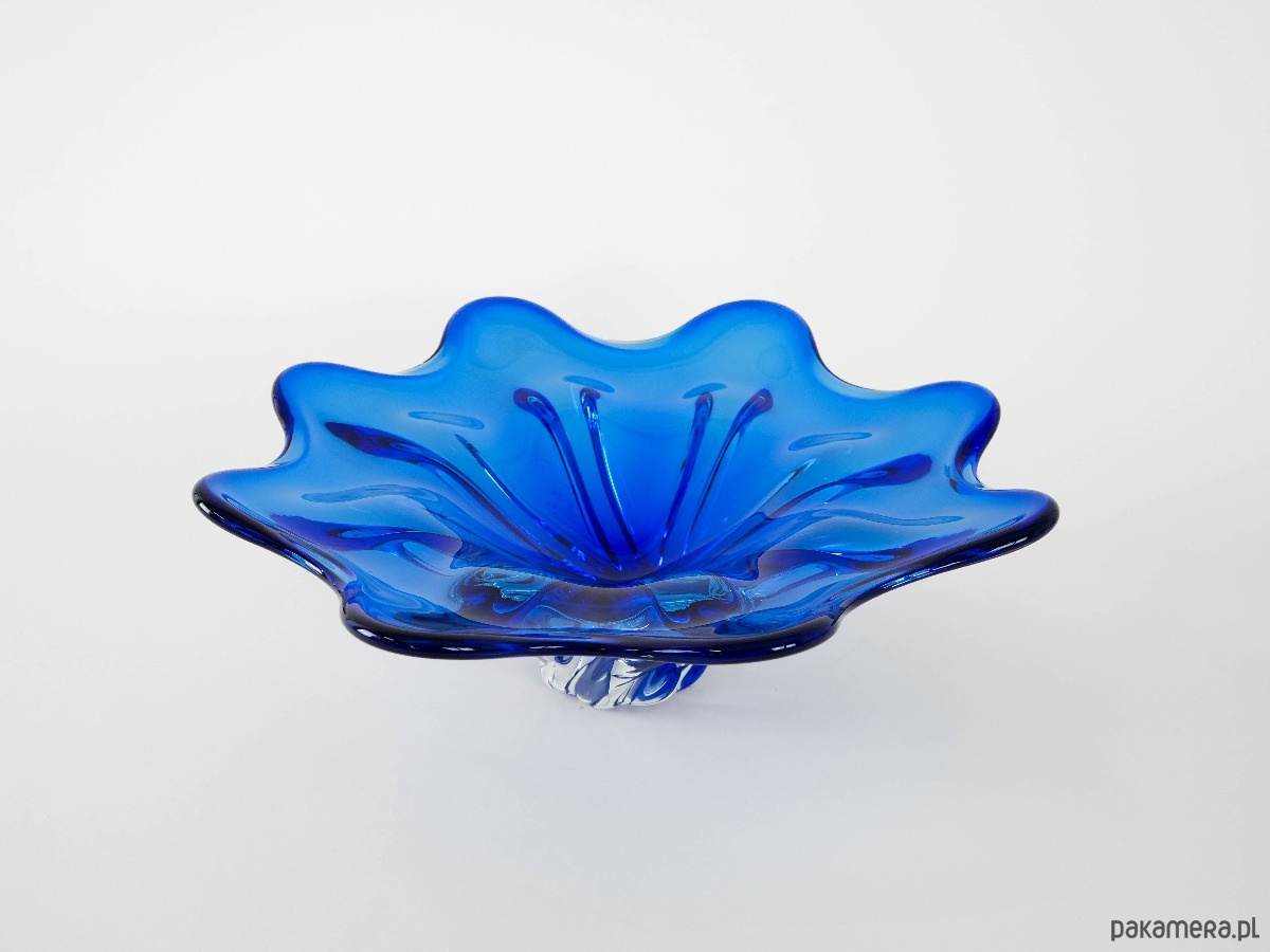 Ręcznie formowana misa z grubego, kryształowego szkła w intensywnym kobaltowym odcieniu. Organiczna, falująca forma z płynnie wywiniętymi brzegami sprawia, że naczynie nabiera rzeźbiarskiego charakteru. Doskonały przykład szkła artystycznego okresu Mid-Century Modern – efektowny element dekoracyjny i kolekcjonerski. Idealna zarówno jako misa dekoracyjna, jak i samodzielna rzeźbiarska forma przyciągająca wzrok.