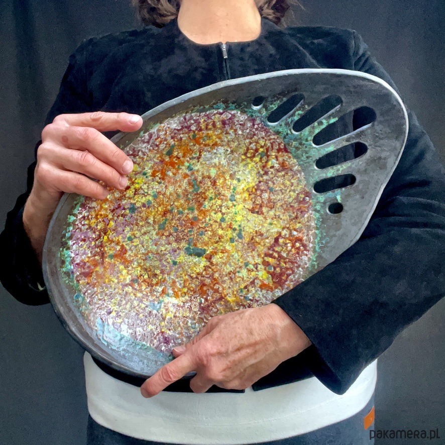 Kolorystyka - wnętrze bajecznie kolorowe w tonacjach pomarańczowych, żółtych, czerwonych, fioletowych i turkusowo zielonych. Brzeg i spód grafitowo czarny.