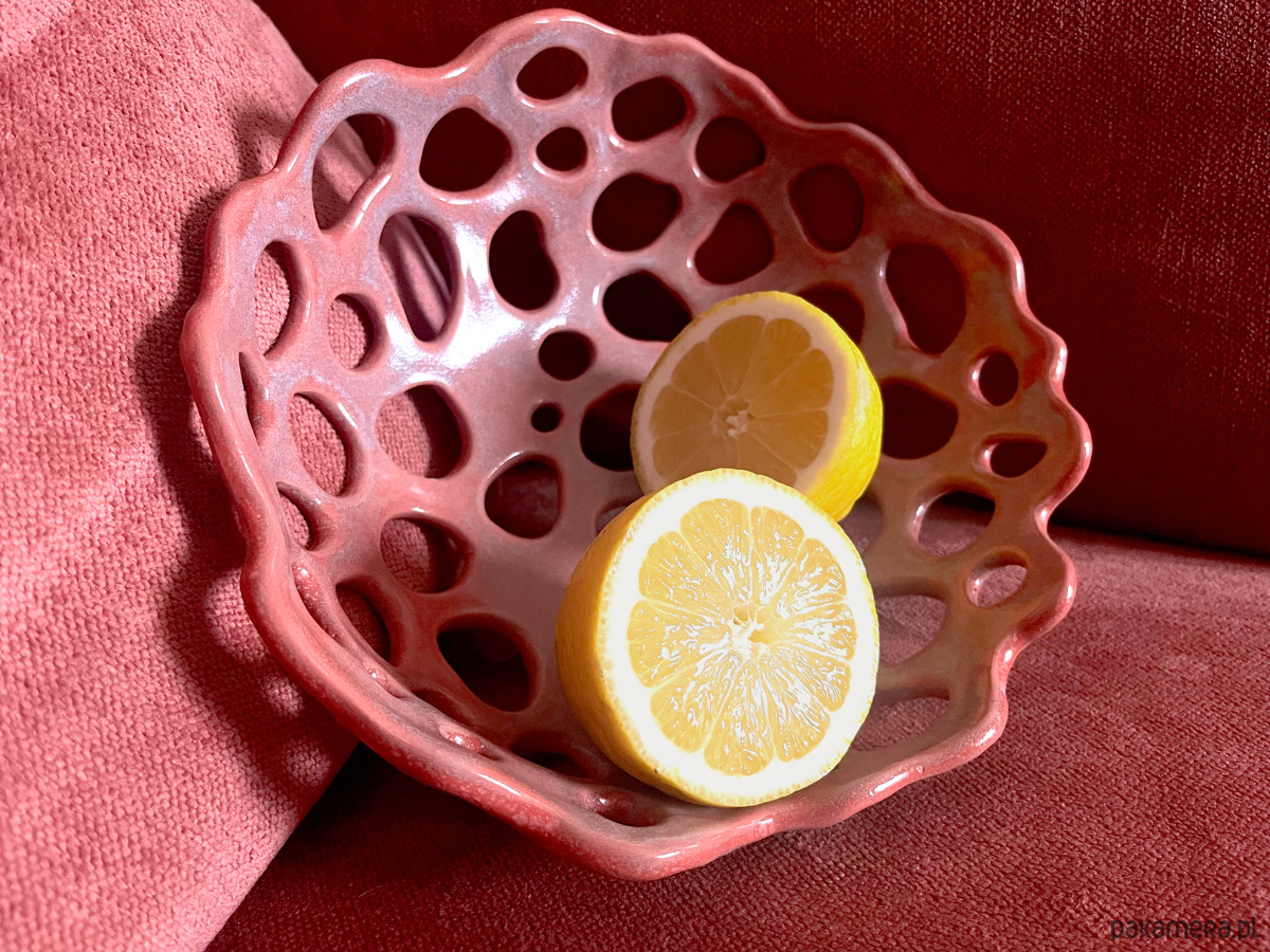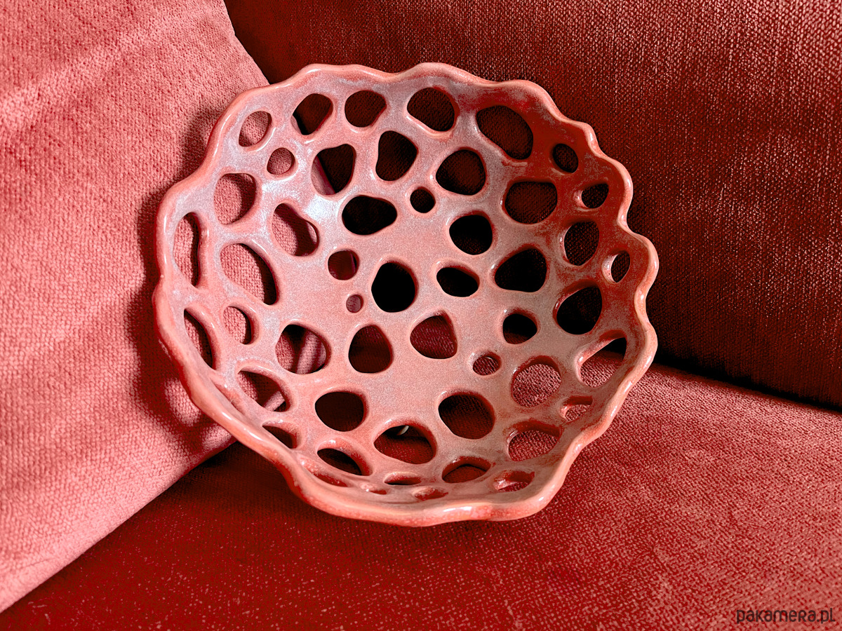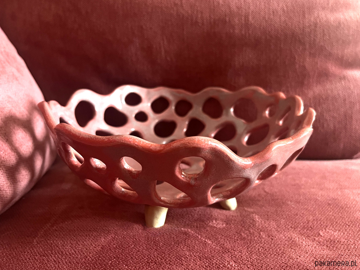 Miska na nóżkach o organicznym kształcie w kolorze terakotowego różu. Świetnie nada się, jako miska na owoce, warzywa lub pieczywo.