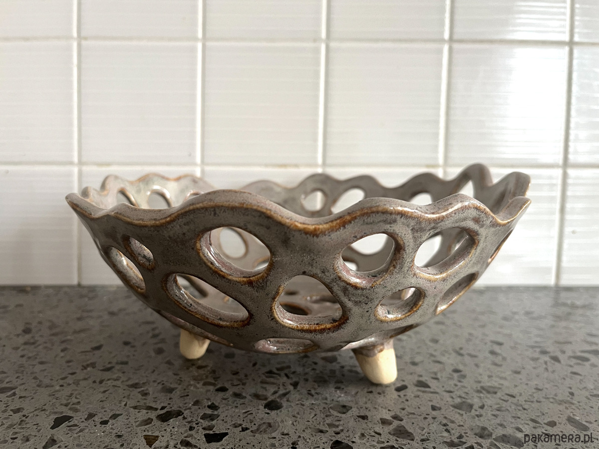 Szara miska na nóżkach o organicznym kształcie. Świetnie nada się, jako miska na owoce, warzywa lub pieczywo.