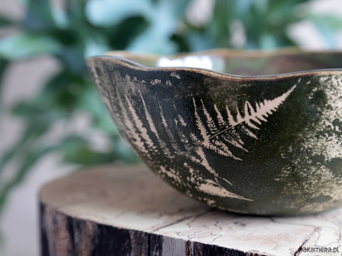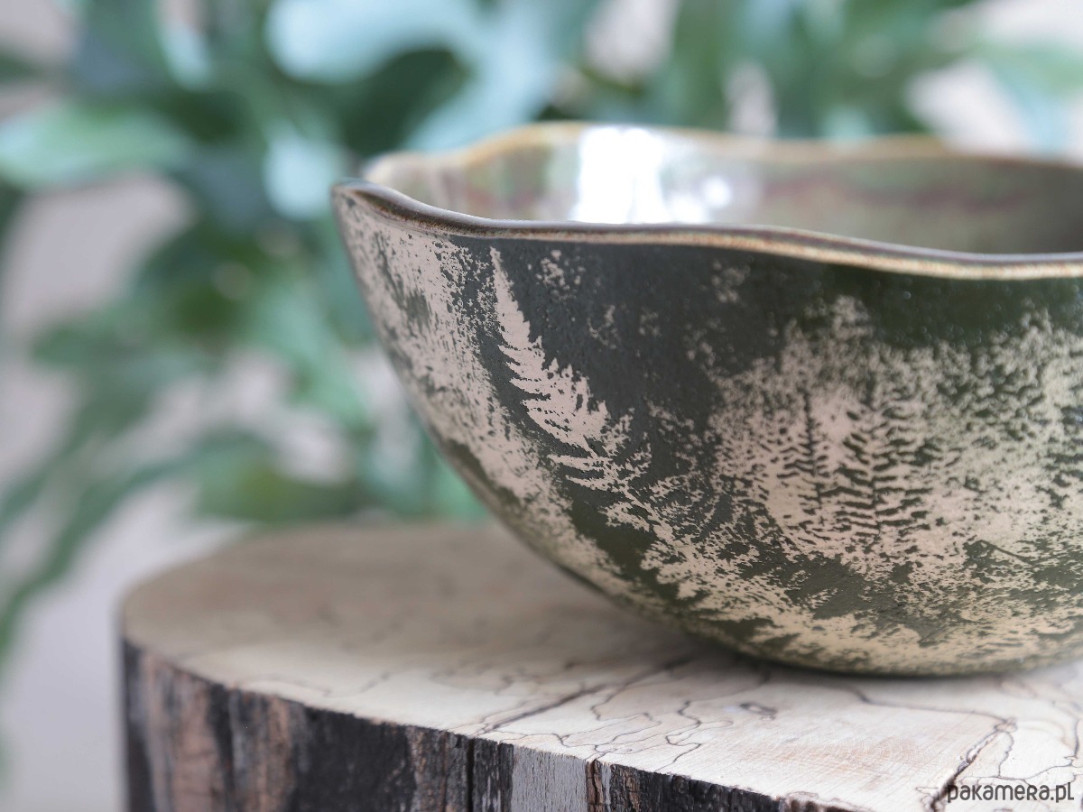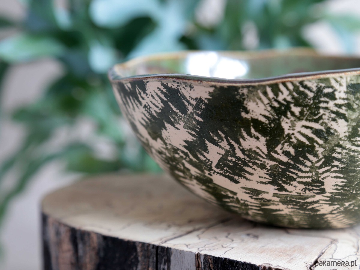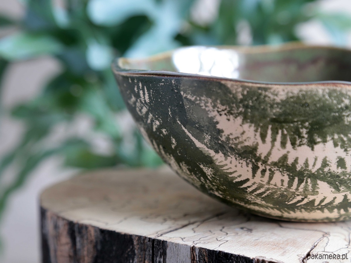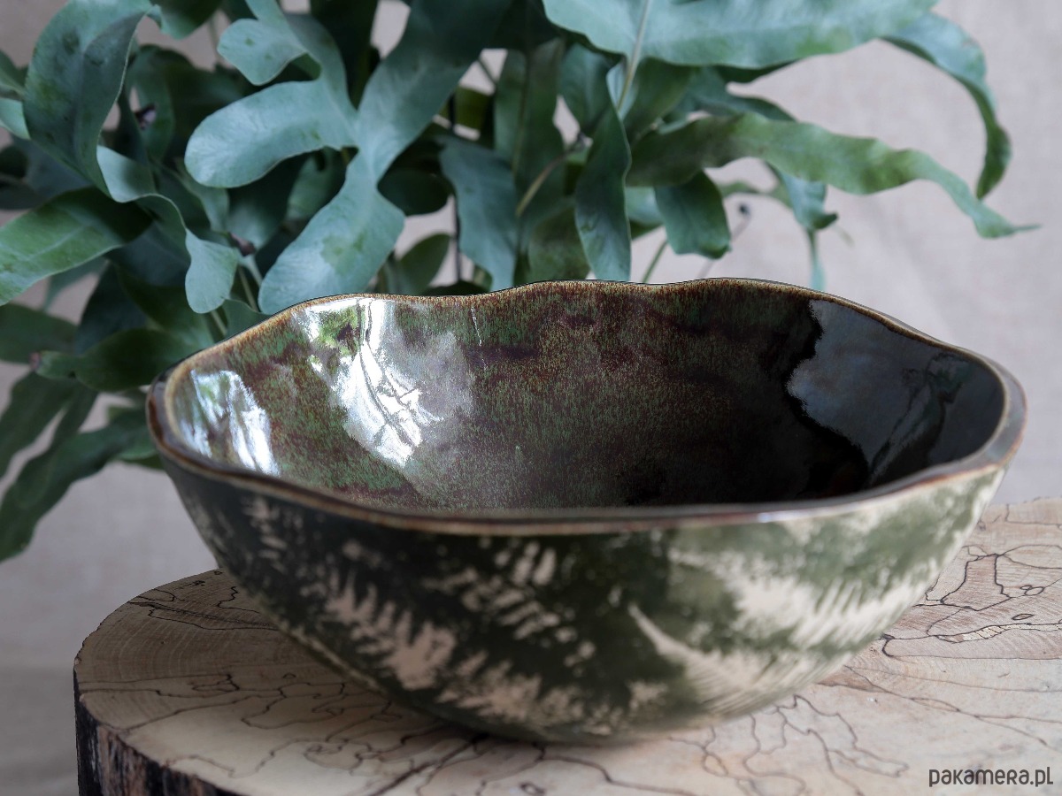 misa lepiona ręcznie z jasnej gliny. wewnątrz szkliwo o pięknej głębokiej zielonej barwie