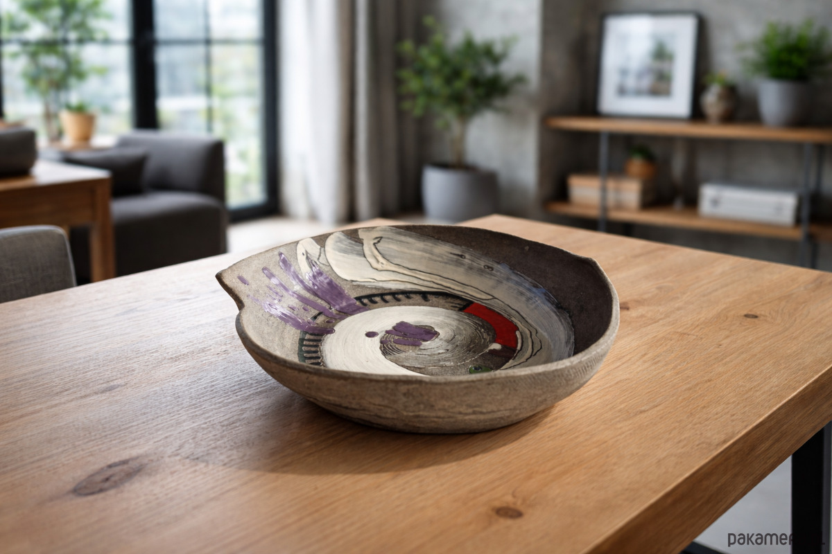 Ręcznie wykonana misa z kamionki o nieregularnym, żywym rancie (średnica do 26 cm, wysokość do 6 cm) przyciąga uwagę organiczną formą i malarską ekspresją. Jest to zapis gestu i wyobraźni twórcy. Surowa, strukturalna masa ceramiczna zestawiona z ekspresyjnym szkliwem tworzy kontrast: spokój materii i intensywność koloru.