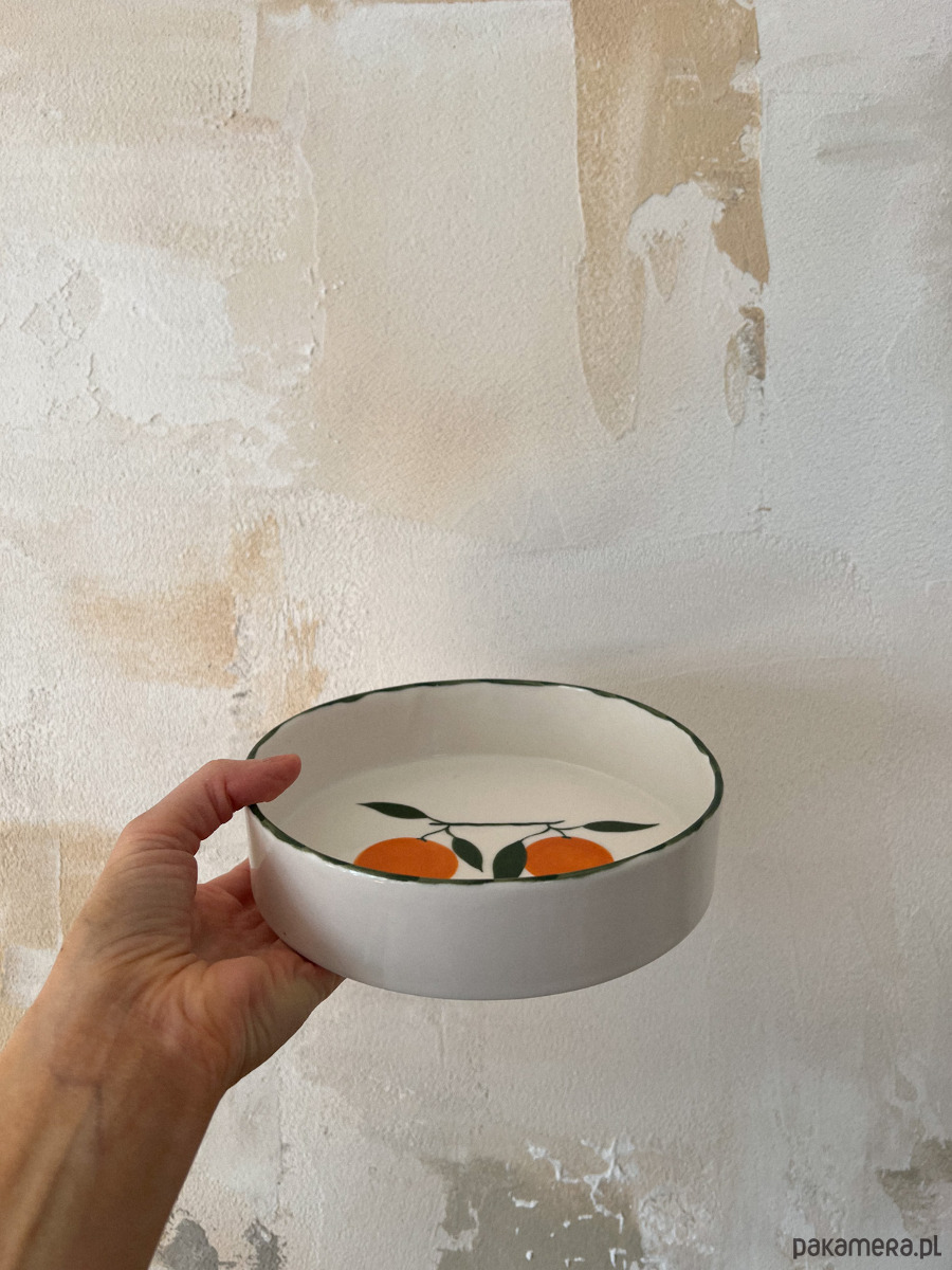 Porcelanowa miska z pomarańczami z zielonym rantem.