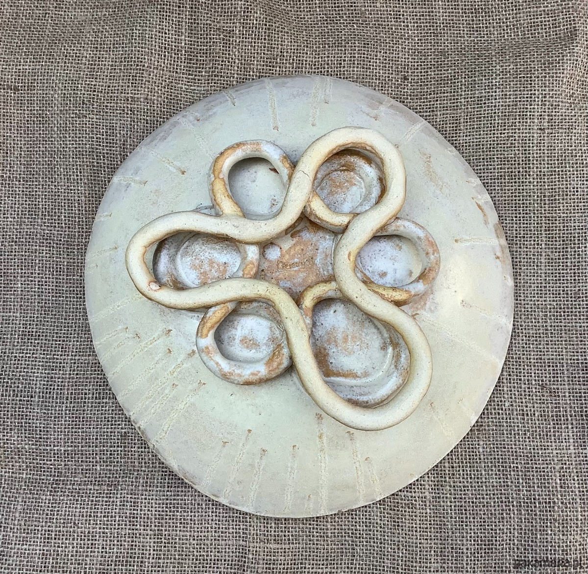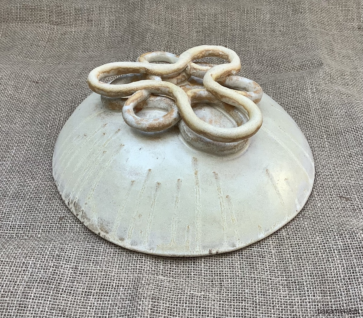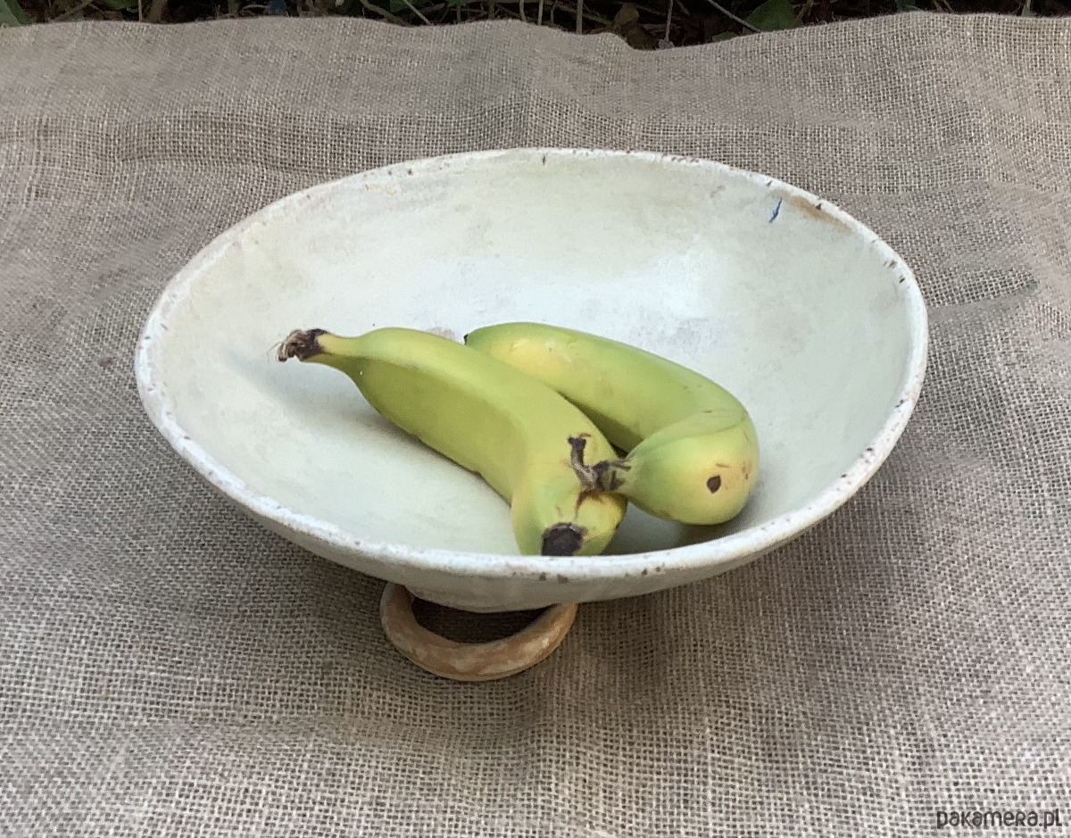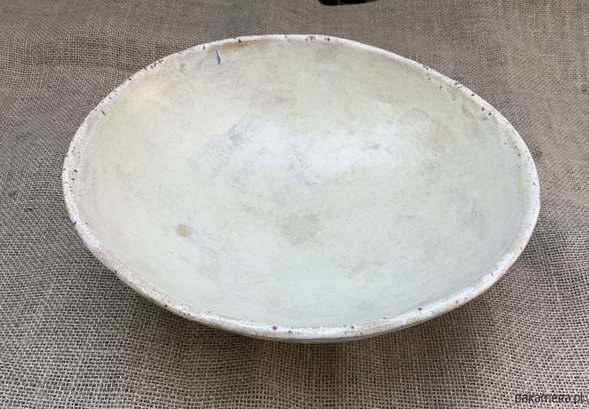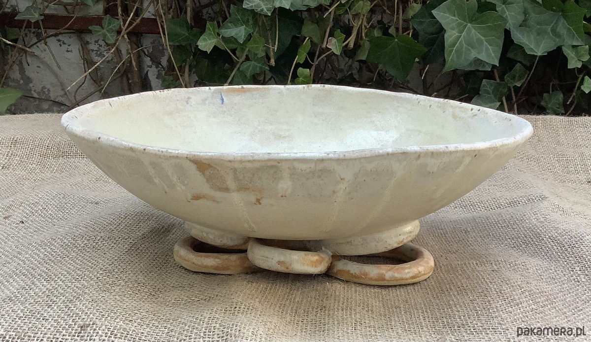 Zapraszam do zakupu misy wykonanej ręcznie z jasnej gliny szamotowej. Misa jest dość ascetyczna w wyglądzie, lecz niewątpliwą jej ozdobą jest podstawa wykonana ze skręcanych wałków gliny. Cała misa została poszkliwiona satynowym szkliwem w odcieniu złamanej bieli.