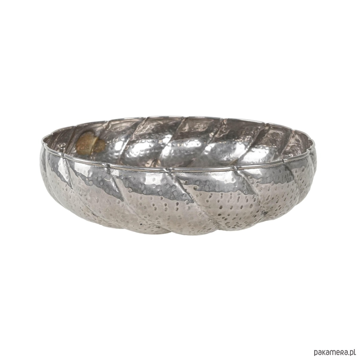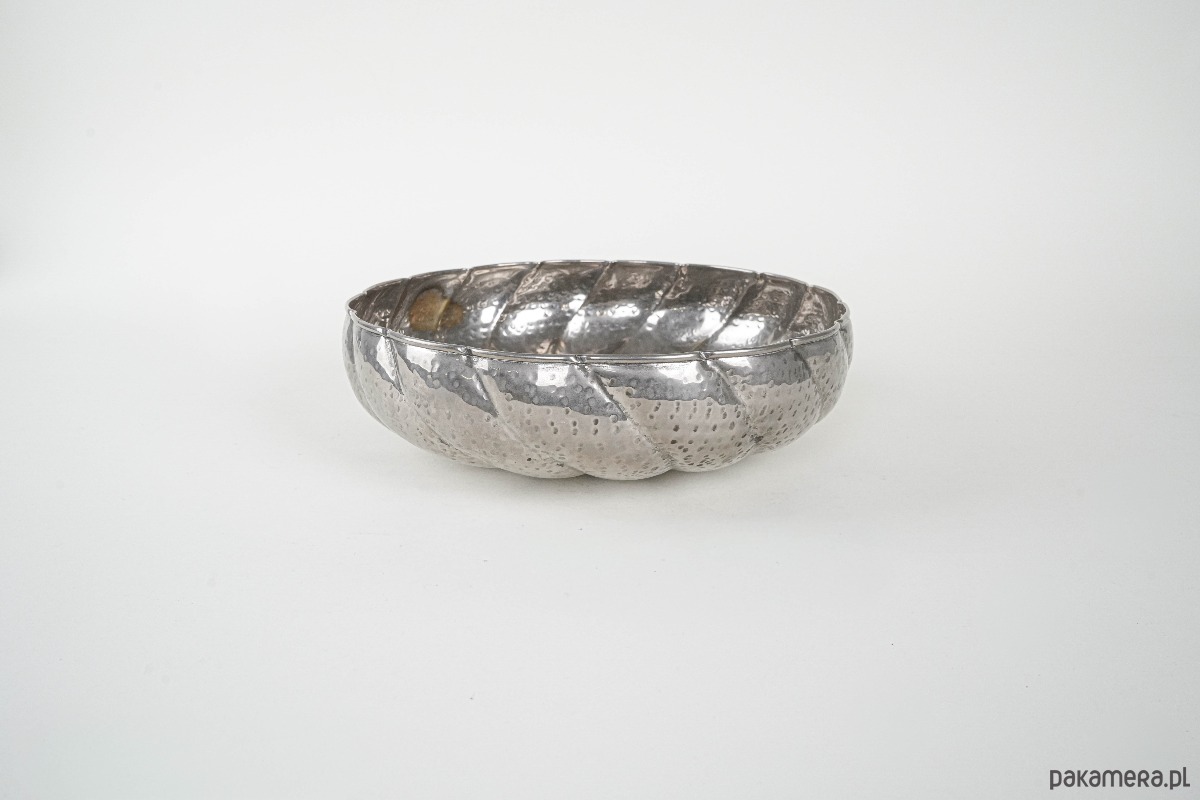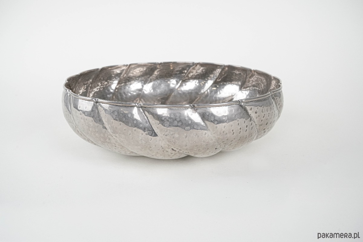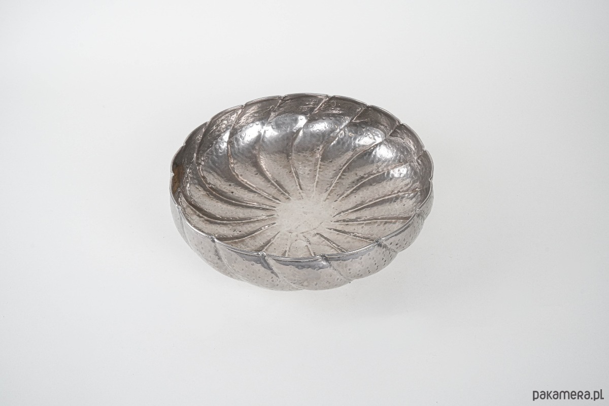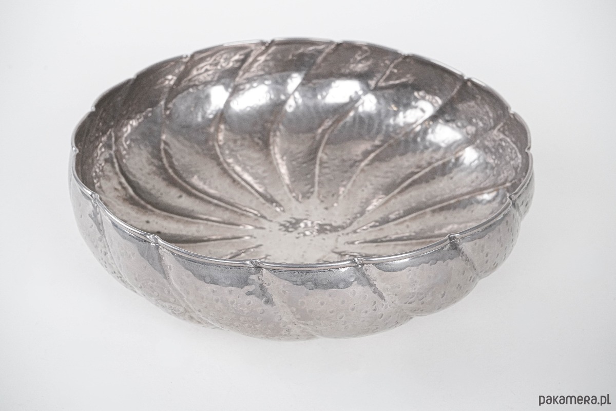 Duża, dekoracyjna misa metalowa w srebrzystym odcieniu, o młotkowanej powierzchni i formie inspirowanej kształtem liścia lub kwiatu. Solidna i efektowna, doskonale sprawdzi się jako naczynie na owoce, orzechy lub samodzielna ozdoba wnętrza.