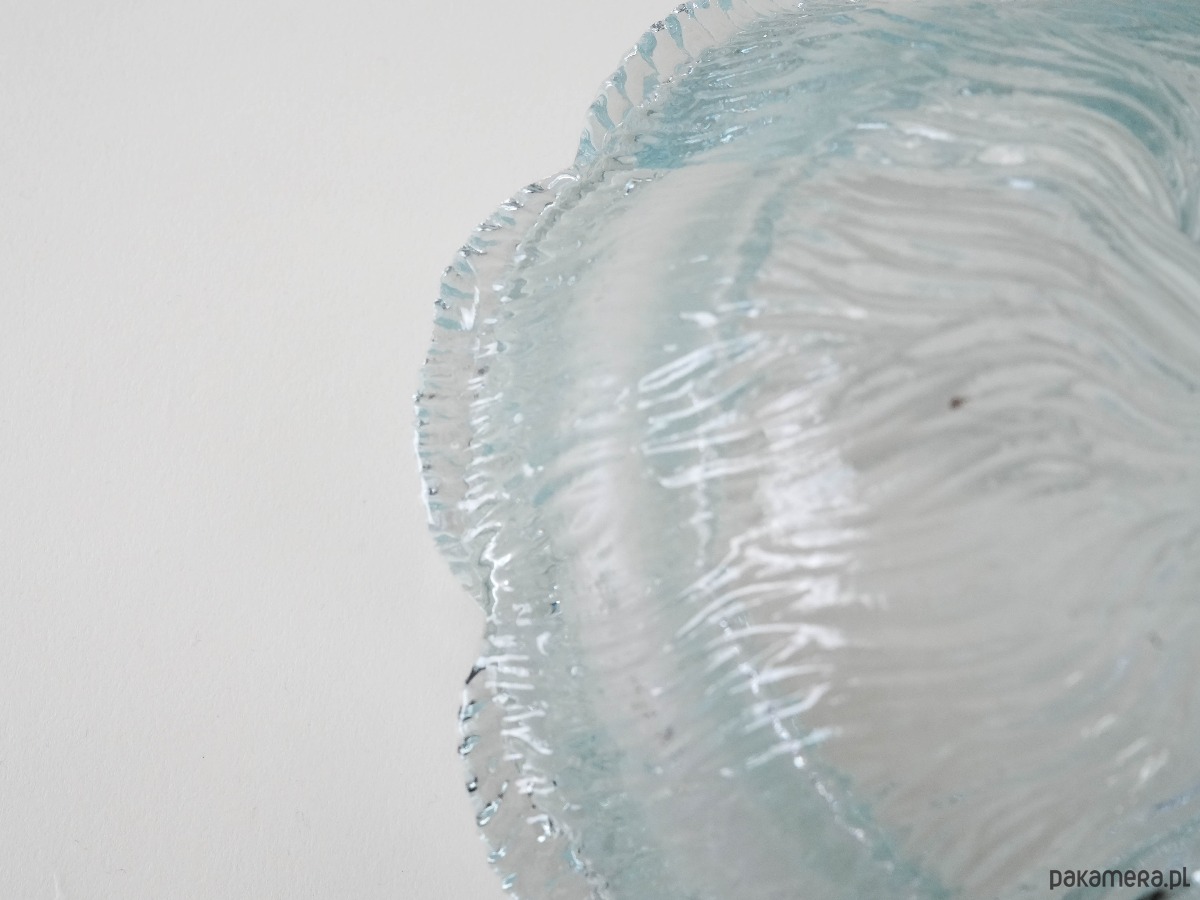 Elegancka miska z fakturowanego szkła, zaprojektowana przez duńską projektantkę Sidse Werner dla legendarnej huty szkła Holmegaard w latach 80. Charakterystyczna organiczna forma z pofalowaną krawędzią i strukturalną powierzchnią szkła doskonale oddaje estetykę skandynawskiego designu. Kolekcjonerski przykład duńskiego szkła artystycznego.