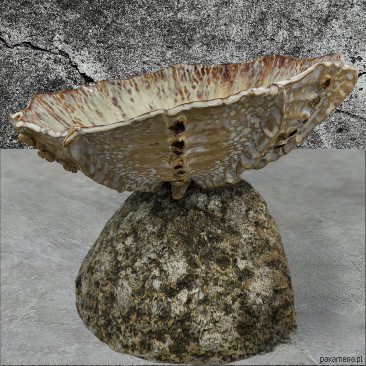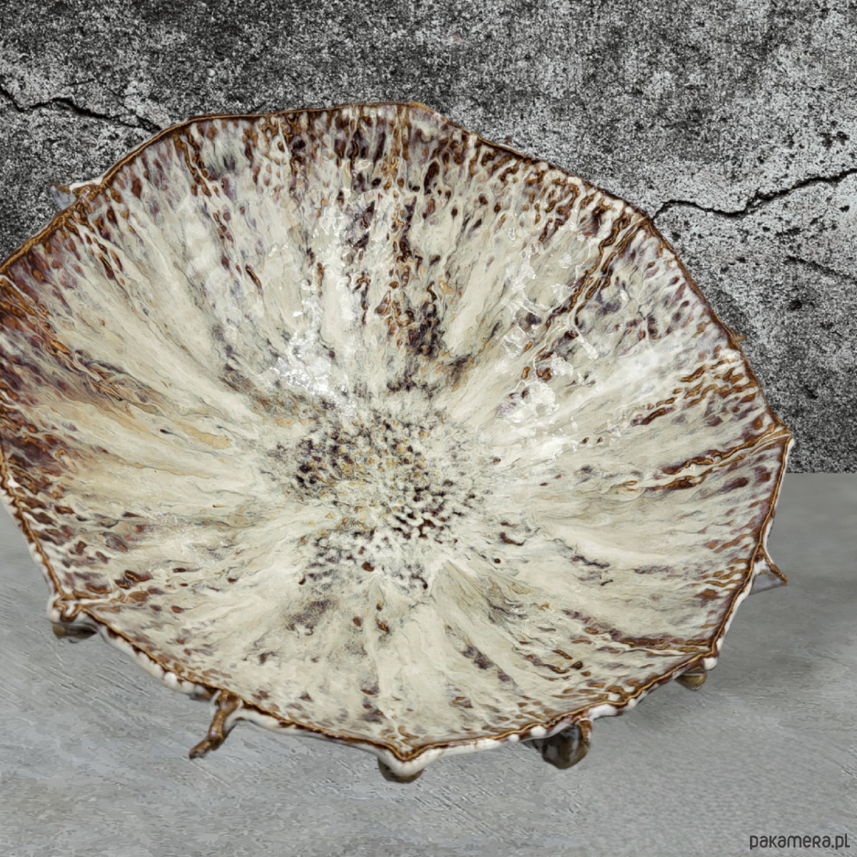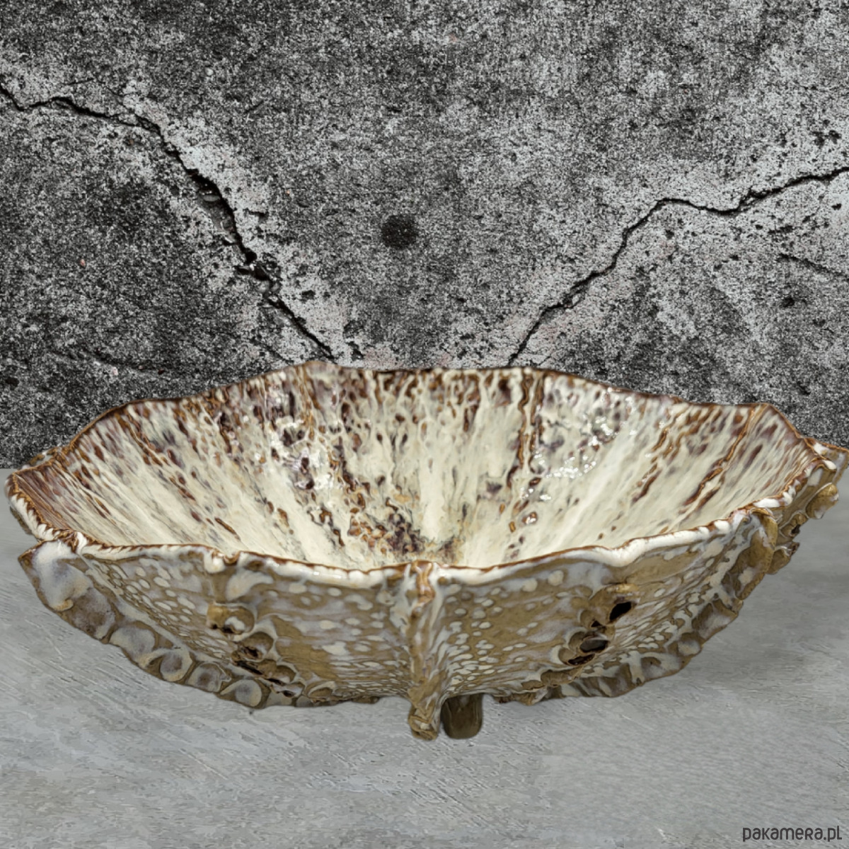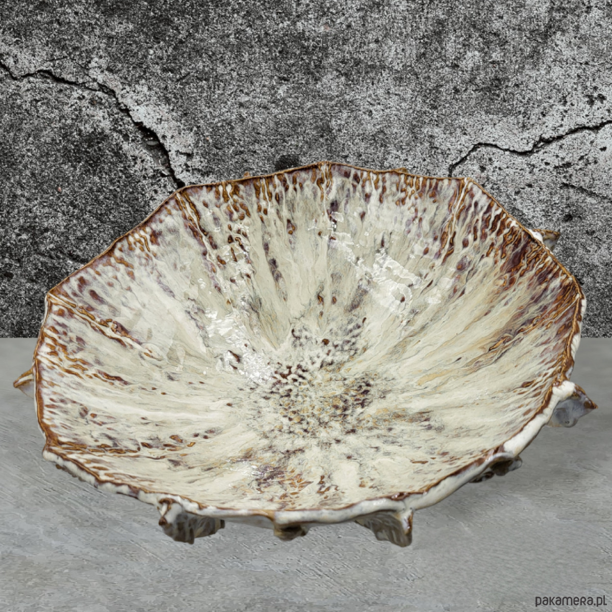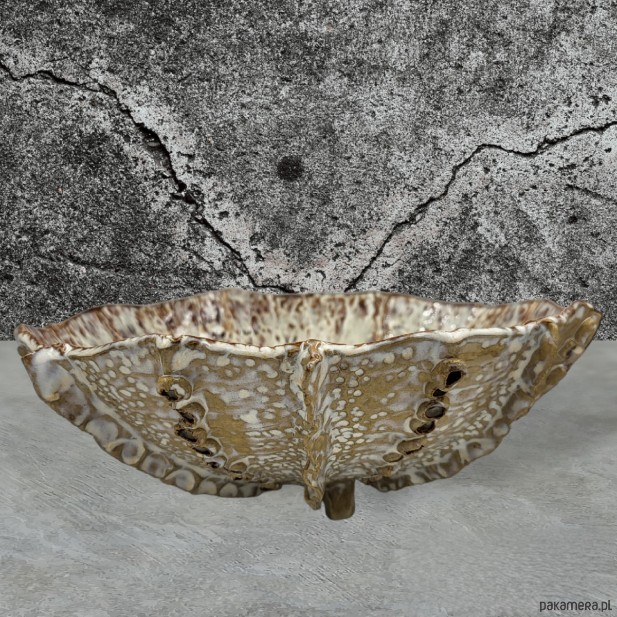 Ręcznie formowana misa na trzech stópkach, przywodząca na myśl morskie podróże.