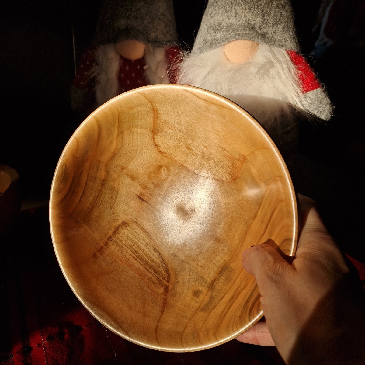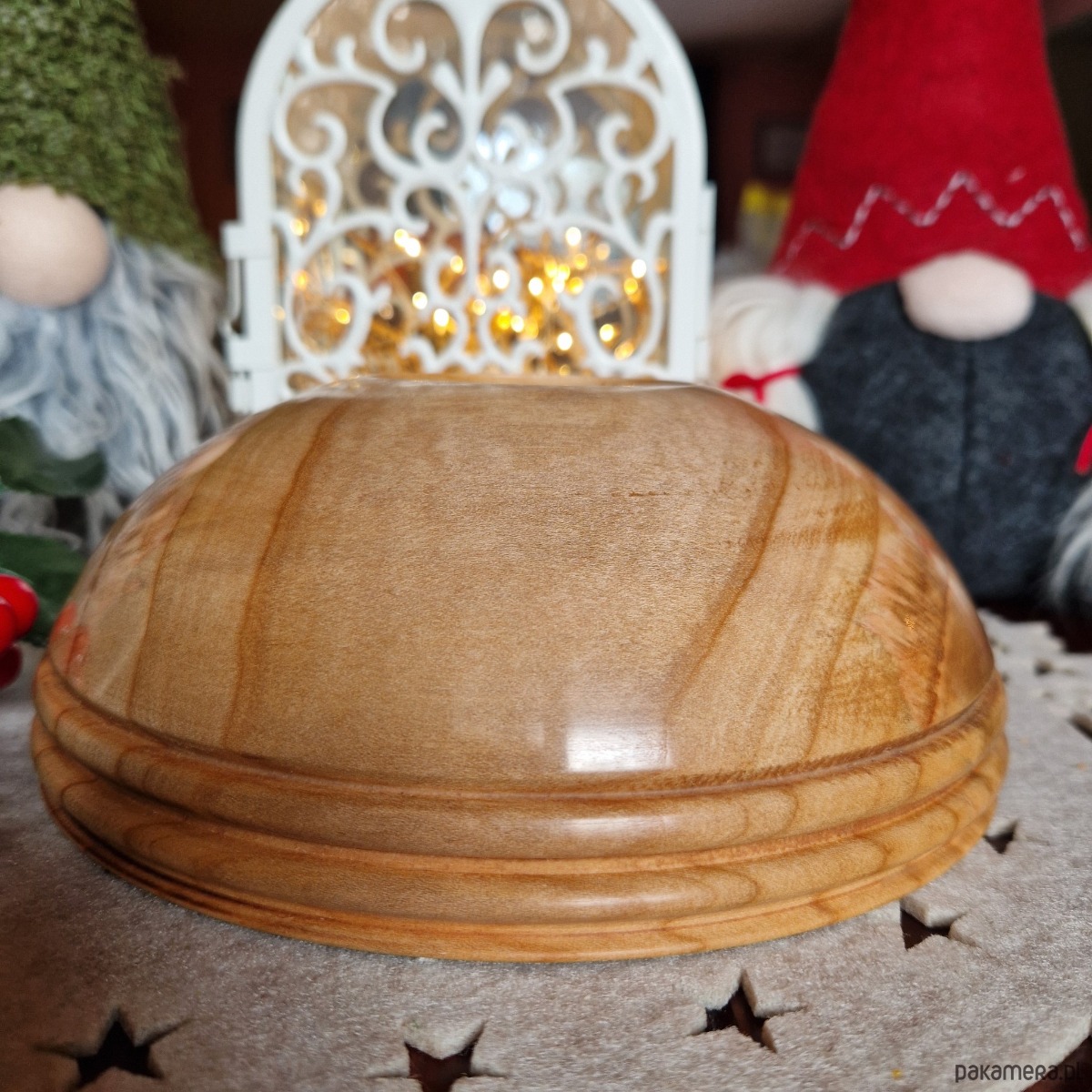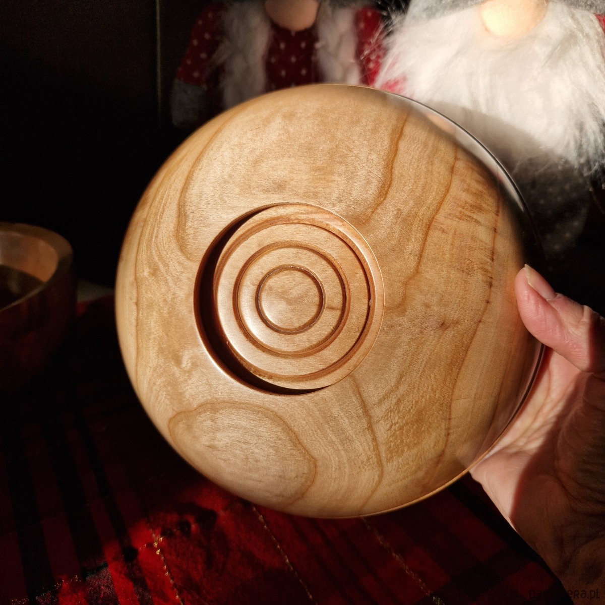 Charakterystyczny, podwójny rant subtelnie otacza misę, dodając profilowi głębi i rytmu, natomiast pięknie zaznaczony, głęboki pierścień na spodzie zapewnia stabilność i nadaje całości rzeźbiarskiego wyrazu. W promieniach słońca starannie wypolerowana powierzchnia delikatnie lśni, odsłaniając bogaty charakter drewna wiśniowego i jego „żywe” usłojenie.
