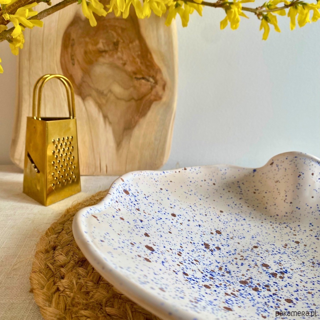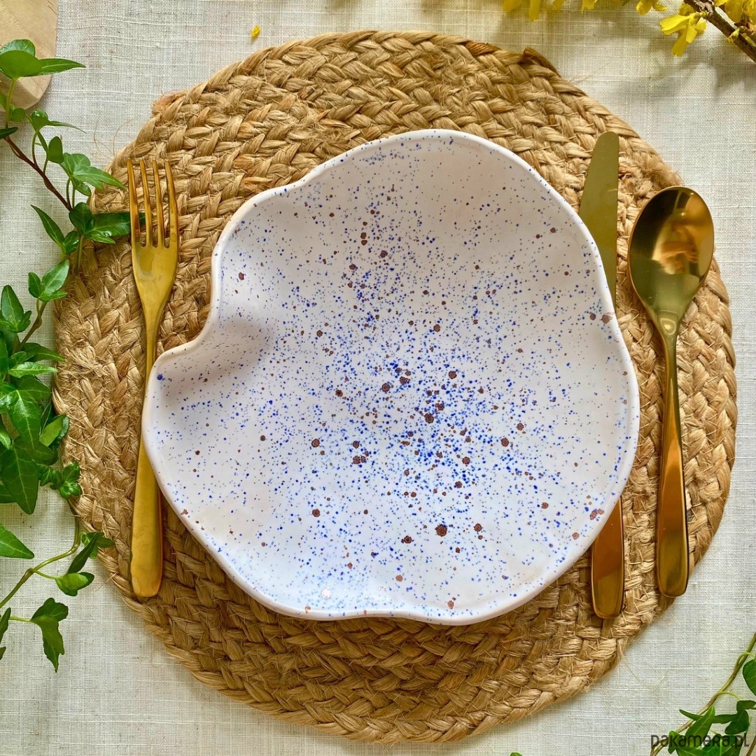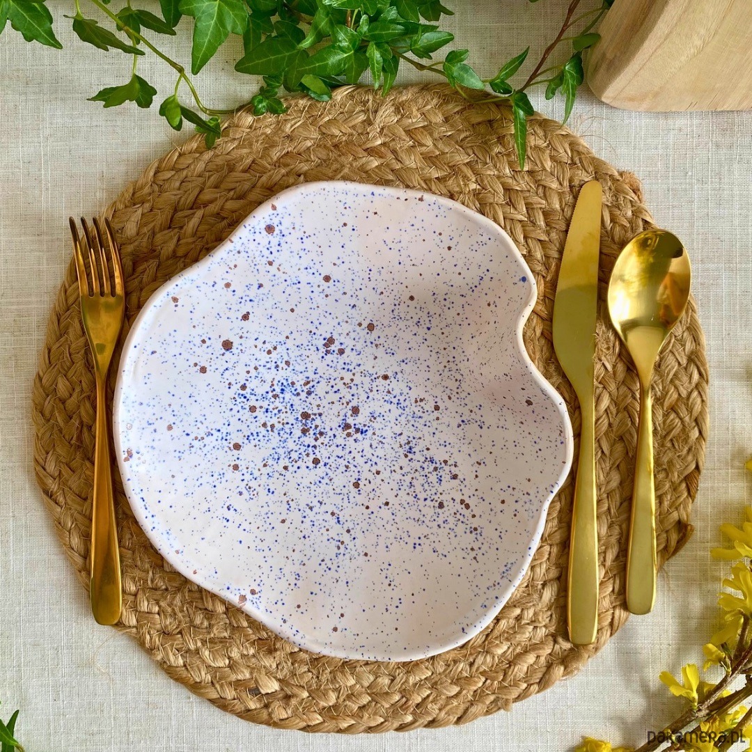 🤍Białe efektowne, satynowe szkliwo w niebieskie i brązowe kropeczki.