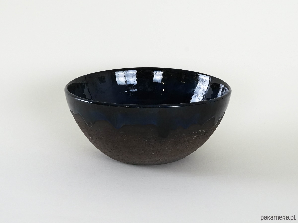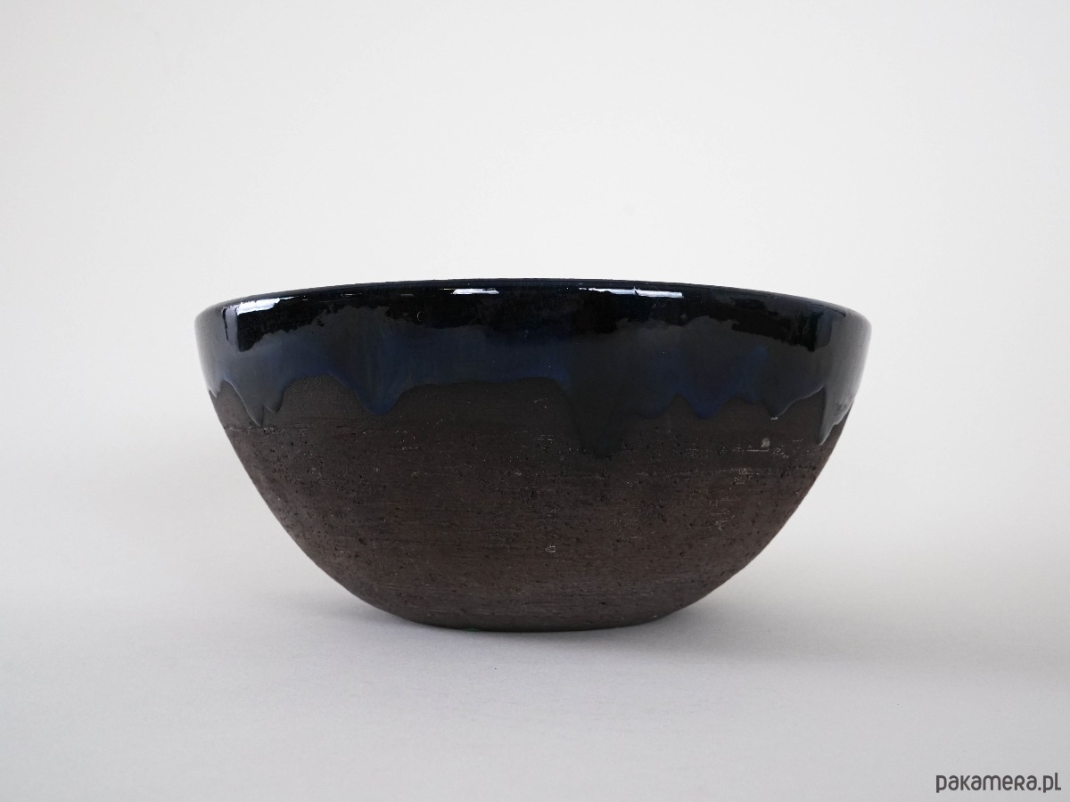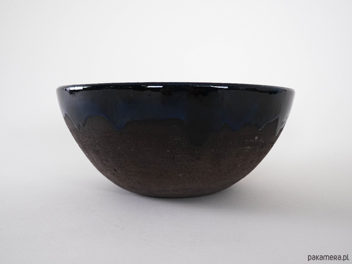 Ceramiczna misa vintage z lat 60./70. XX wieku, o klasycznej półkolistej formie. Wnętrze i górna partia pokryte zostały głębokim, kobaltowo-granatowym szkliwem z lekko nieregularnym spływem, co nadaje całości wyrazistego charakteru i rękodzielniczego uroku. Dolna część misy pozostaje w surowym, matowym wykończeniu, które kontrastuje z lśniącym szkliwem i podkreśla naturalne piękno kamionki.