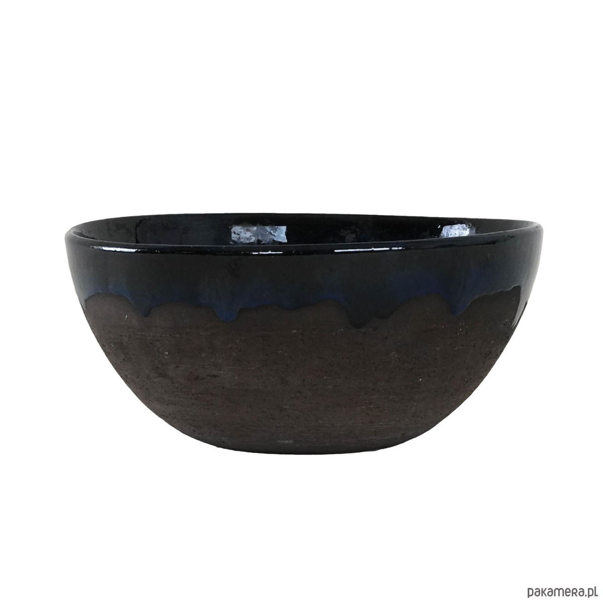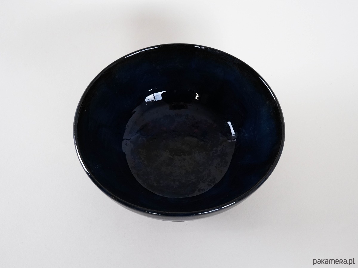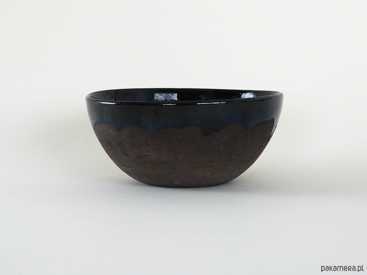 Ceramiczna misa vintage z lat 60./70. XX wieku, o klasycznej półkolistej formie. Wnętrze i górna partia pokryte zostały głębokim, kobaltowo-granatowym szkliwem z lekko nieregularnym spływem, co nadaje całości wyrazistego charakteru i rękodzielniczego uroku. Dolna część misy pozostaje w surowym, matowym wykończeniu, które kontrastuje z lśniącym szkliwem i podkreśla naturalne piękno kamionki.