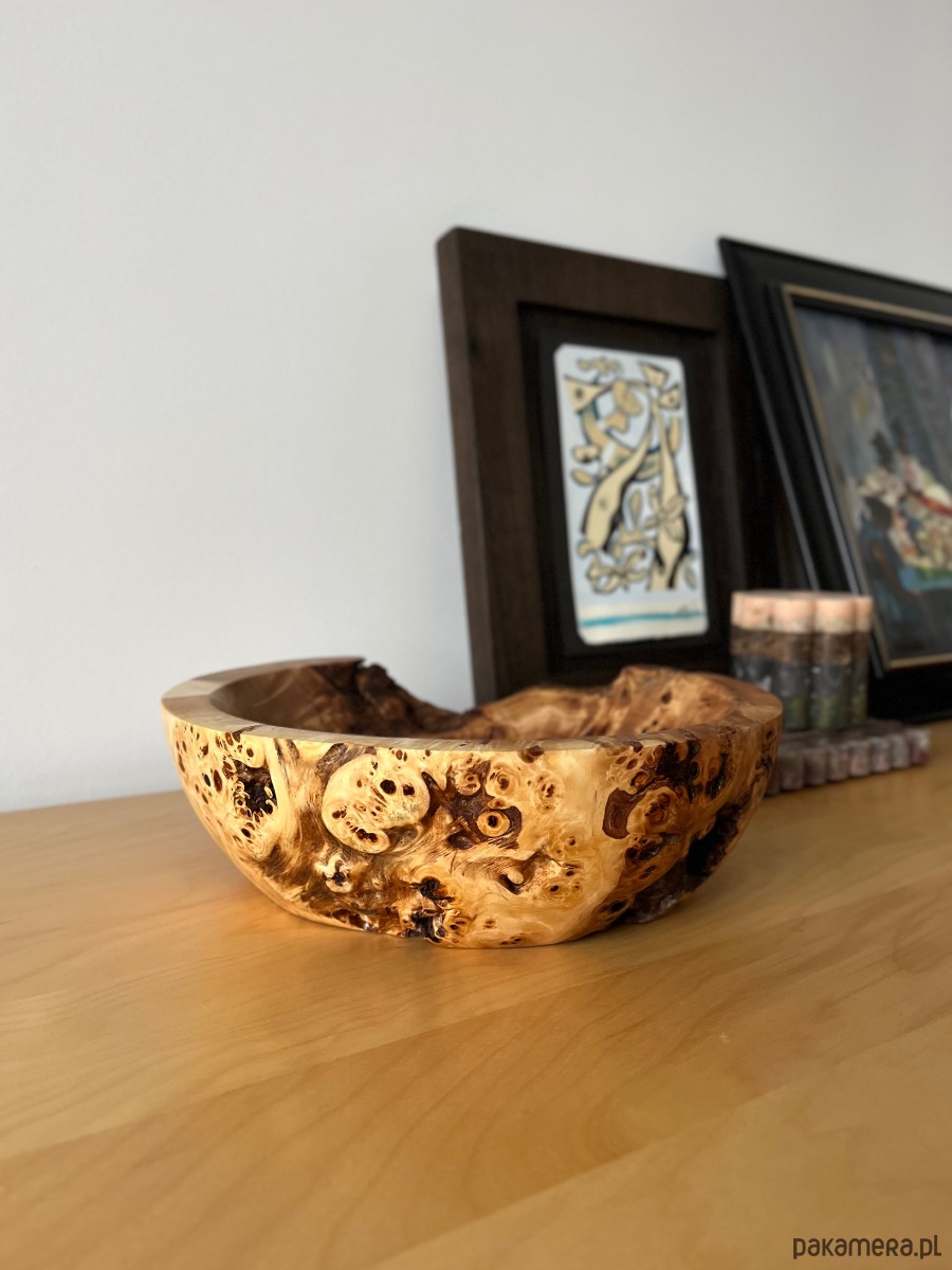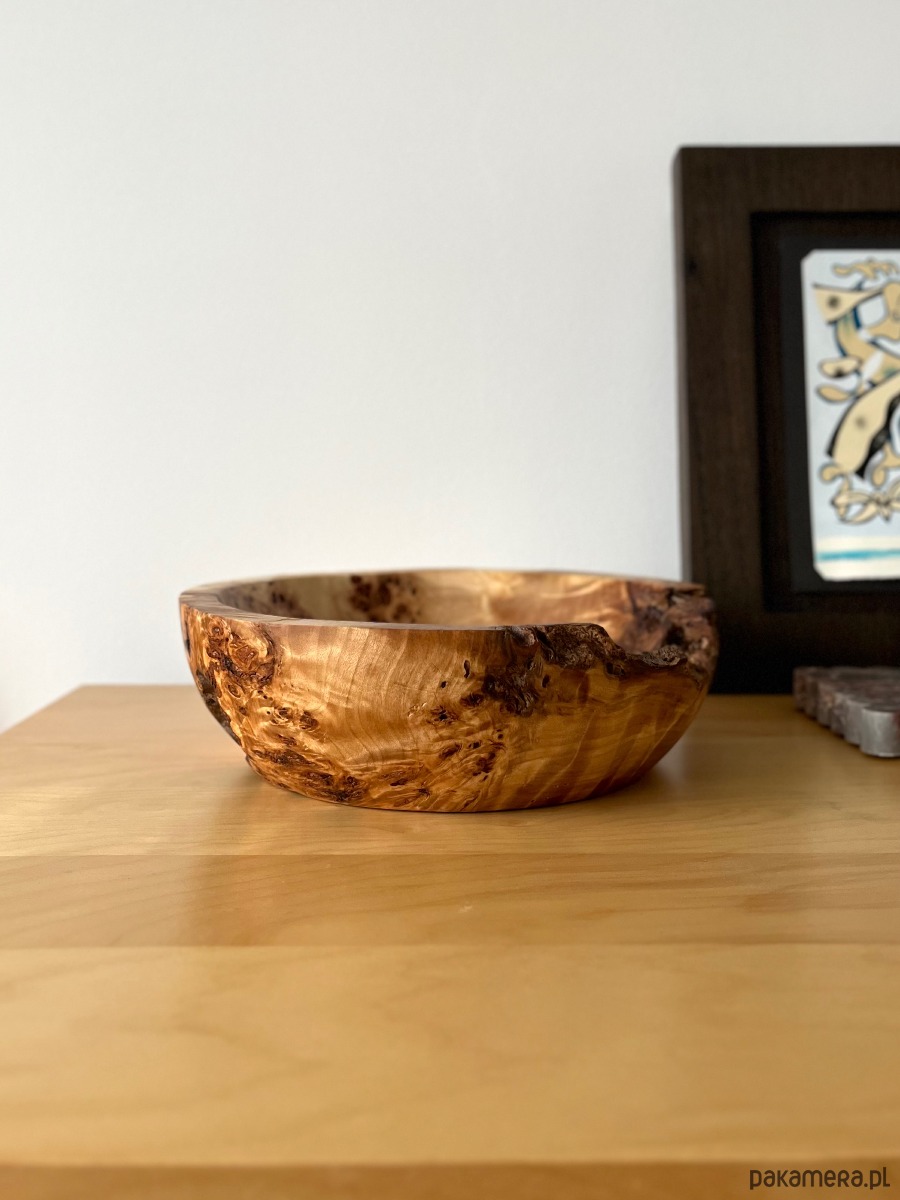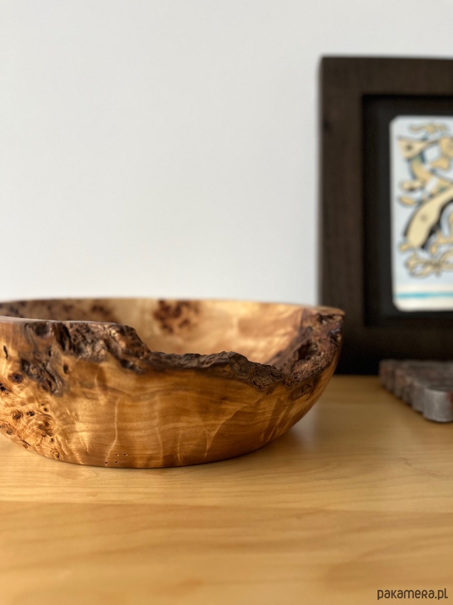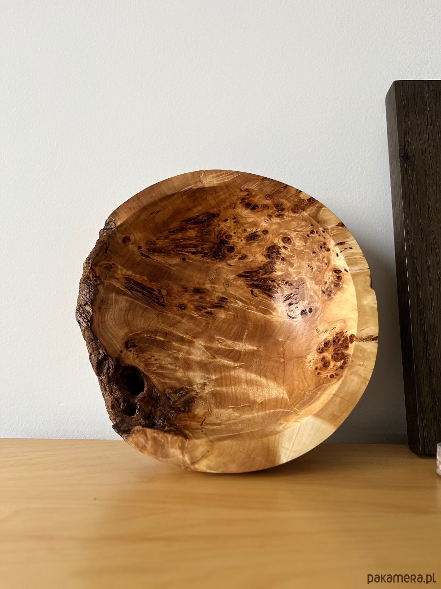 Wyjątkowo barwna misa z ubytkami i naturalnym brzegiem, wykonana z jednego, litego kawałka drewna czeczoty. Czeczota nadaje charakter misy i wyjątkowe ubarwienie. Została pokryta olejem nadającym się, zgodnie z deklaracją producenta, do kontaktu z żywnością.