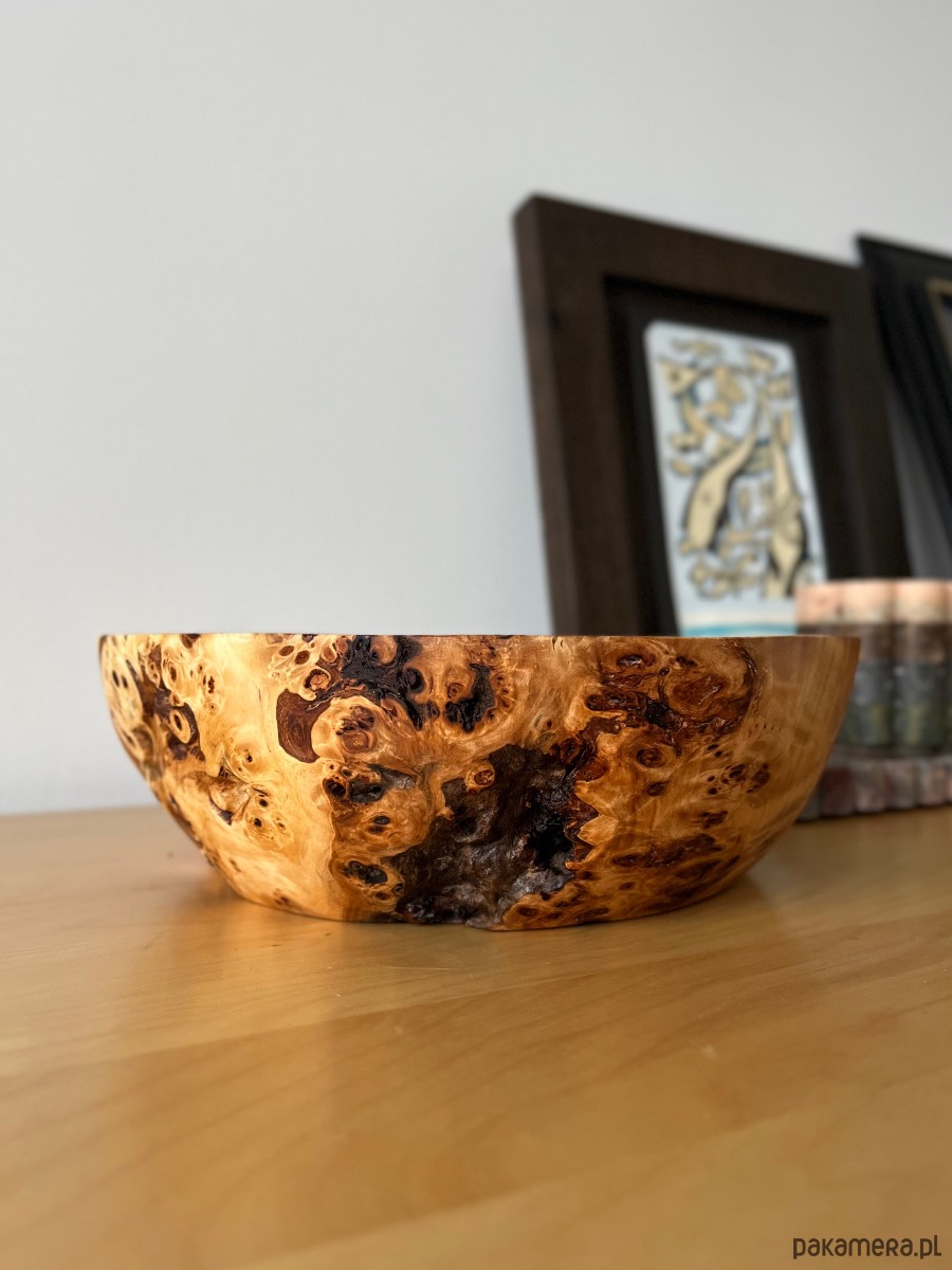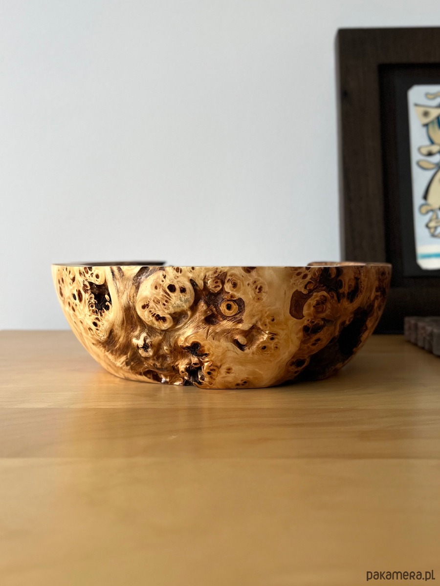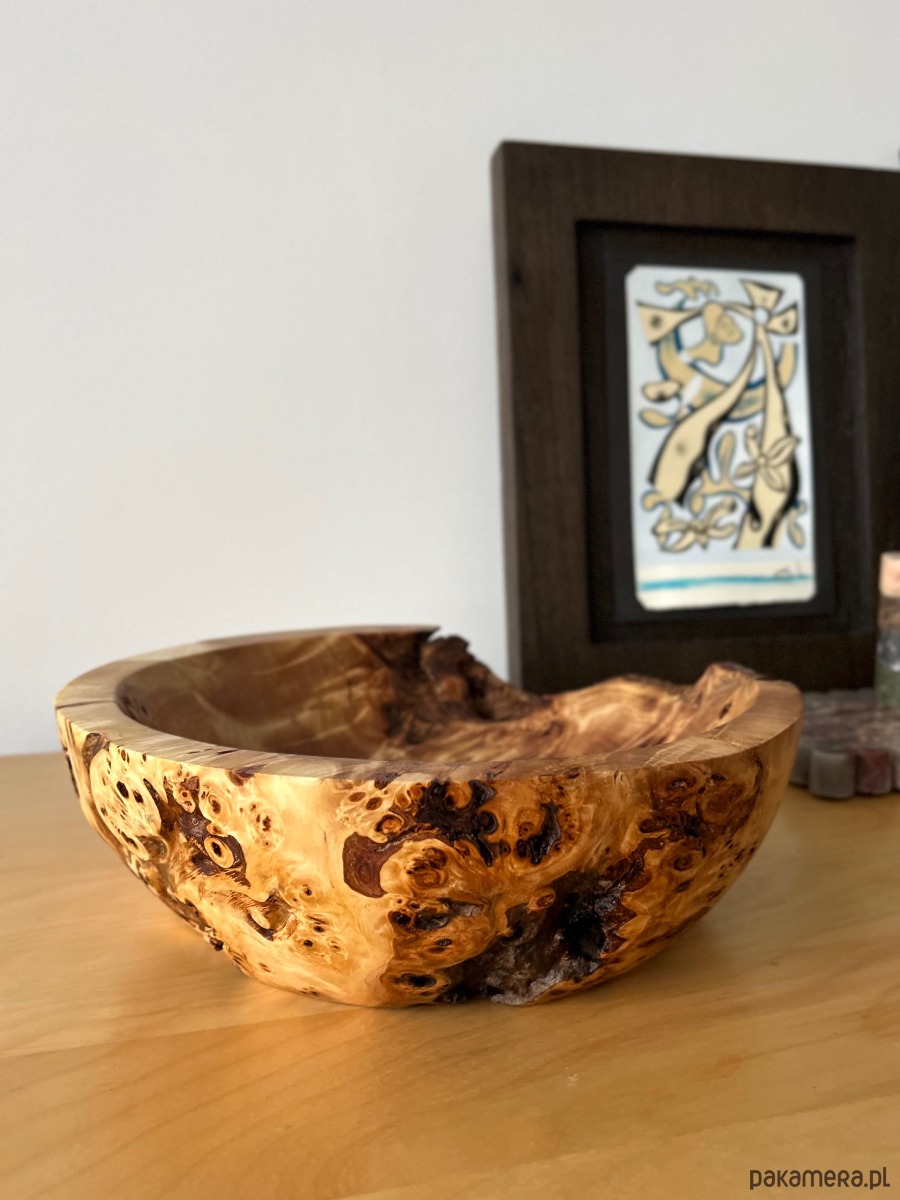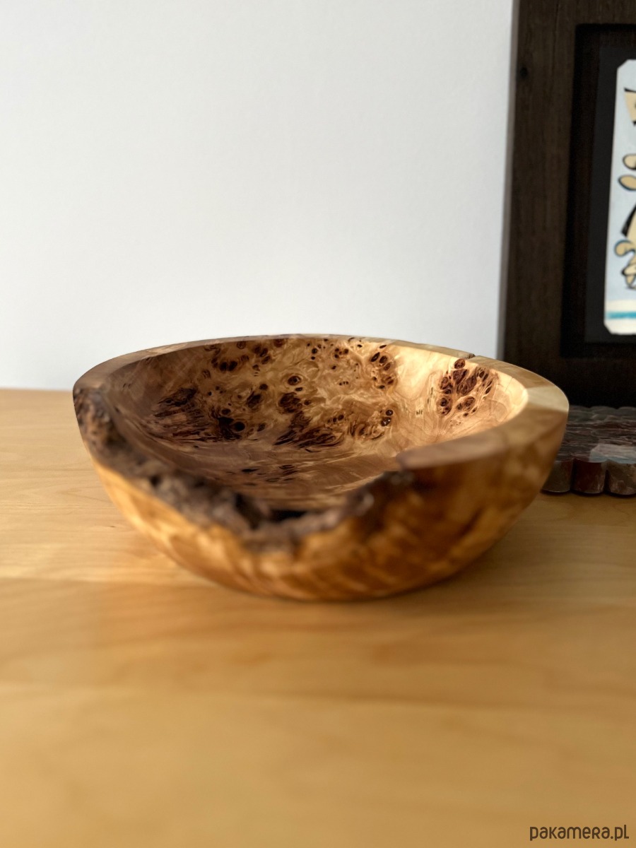 Wyjątkowo barwna misa z ubytkami i naturalnym brzegiem, wykonana z jednego, litego kawałka drewna czeczoty. Czeczota nadaje charakter misy i wyjątkowe ubarwienie. Została pokryta olejem nadającym się, zgodnie z deklaracją producenta, do kontaktu z żywnością.