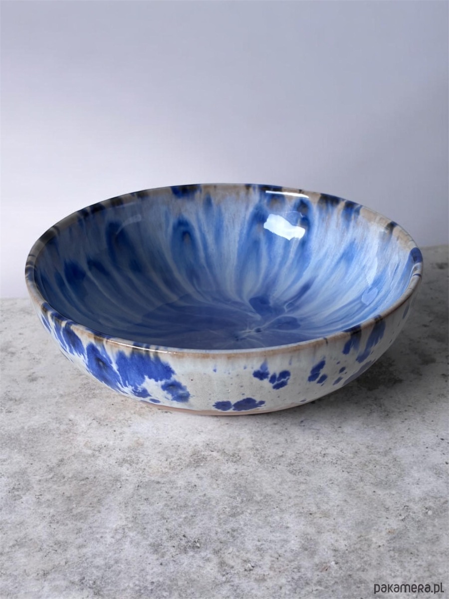 Szkliwo swoją kolorystyką nawiązuje do spływających kropli morskiej wody ,tworzy subtelny , naturalny efekt jako odniesienie do kolorów, tekstury i wzorów, które przypominają rytm i dynamikę morskich fal. Każda sztuka jest unikatowa dzięki delikatnym przejściom kolorystycznym i ręcznemu wykończeniu. Idealna do serwowania przekąsek, dipów , deserów lub jako dekoracyjny akcent w Twoim wnętrzu.