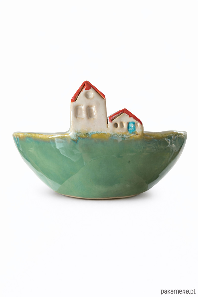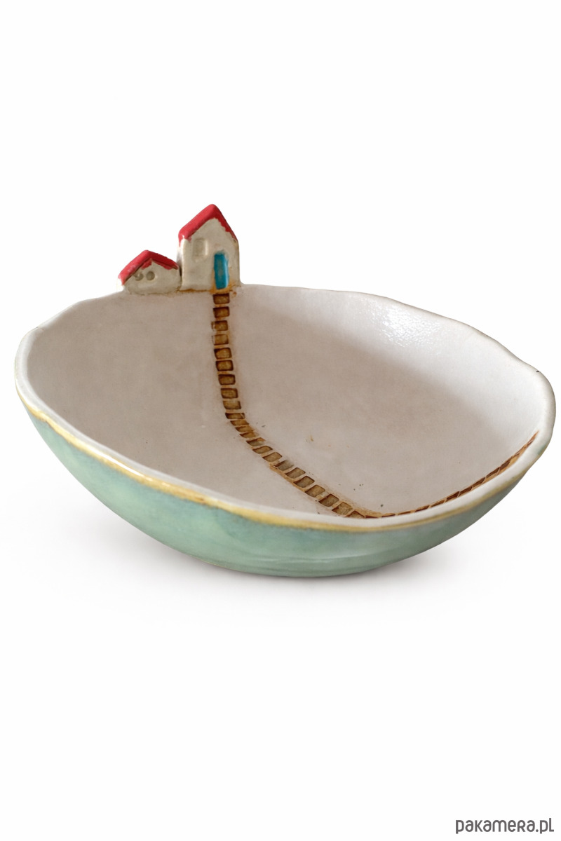 Ręcznie wykonana ceramiczna miska z dekoracyjnym motywem małych domków. Oryginalna forma i subtelne detale nadają jej wyjątkowy, artystyczny charakter. Idealnie sprawdzi się jako miska na drobne przekąski, biżuterię lub jako dekoracja stołu czy półki.