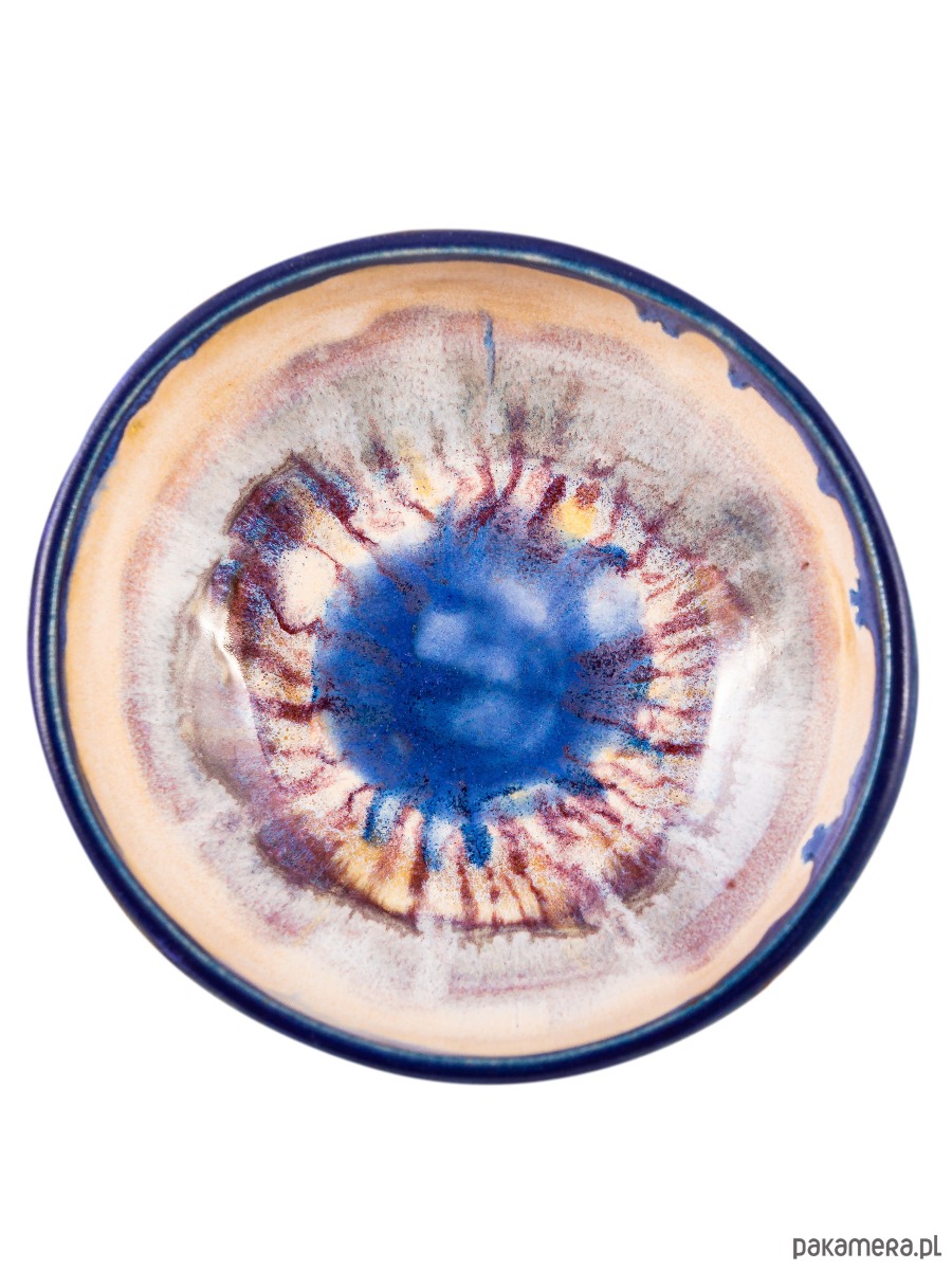 Wnętrze miseczki jest jaśniejsze. Przy krawędzi dominuje kremowo-piaskowy odcień, który stopniowo przechodzi w chłodne błękity i przydymione niebieskości zbierające się przy dnie.