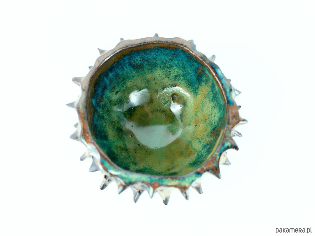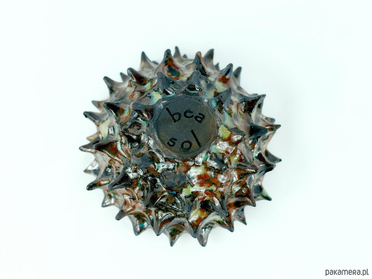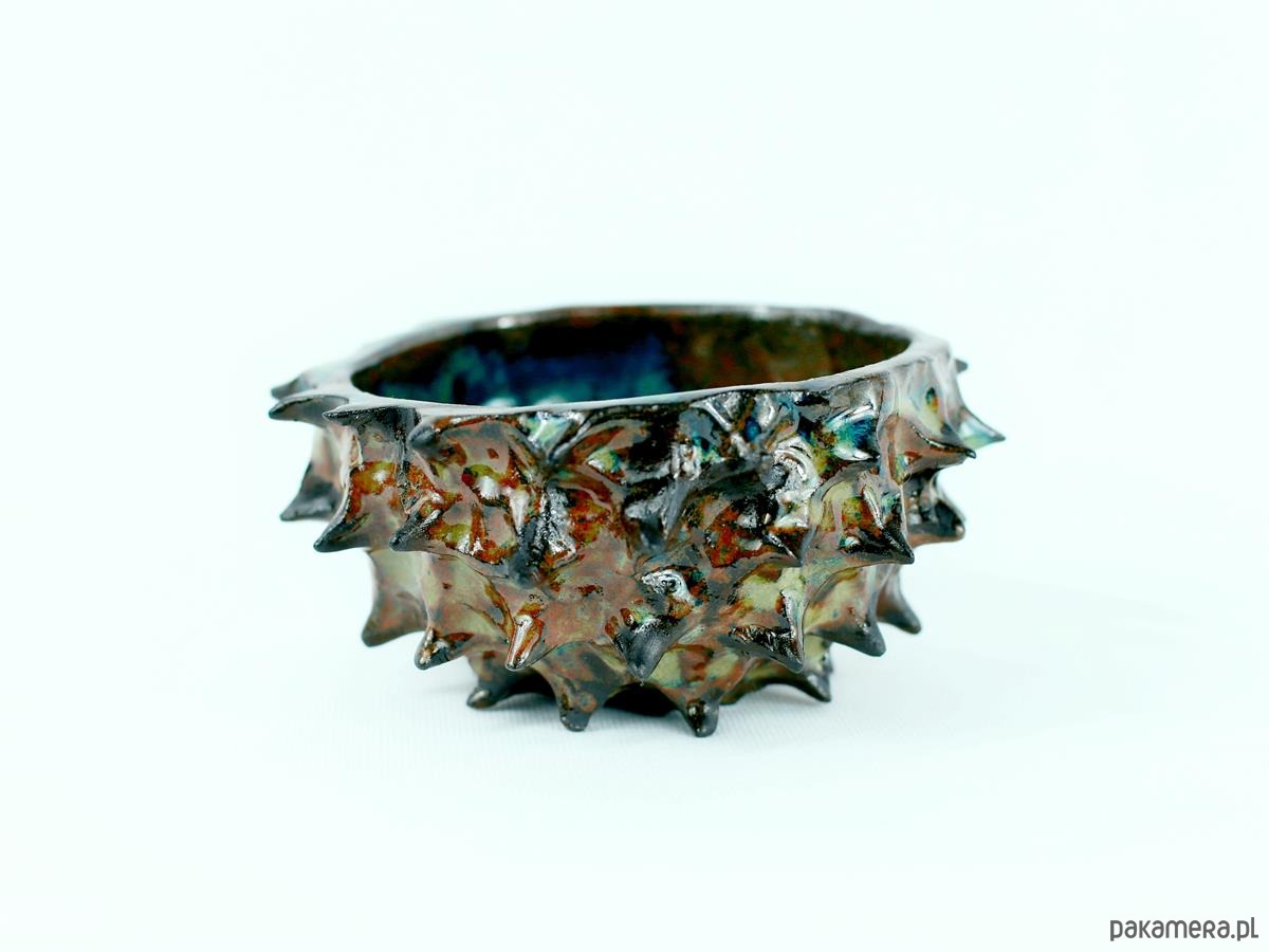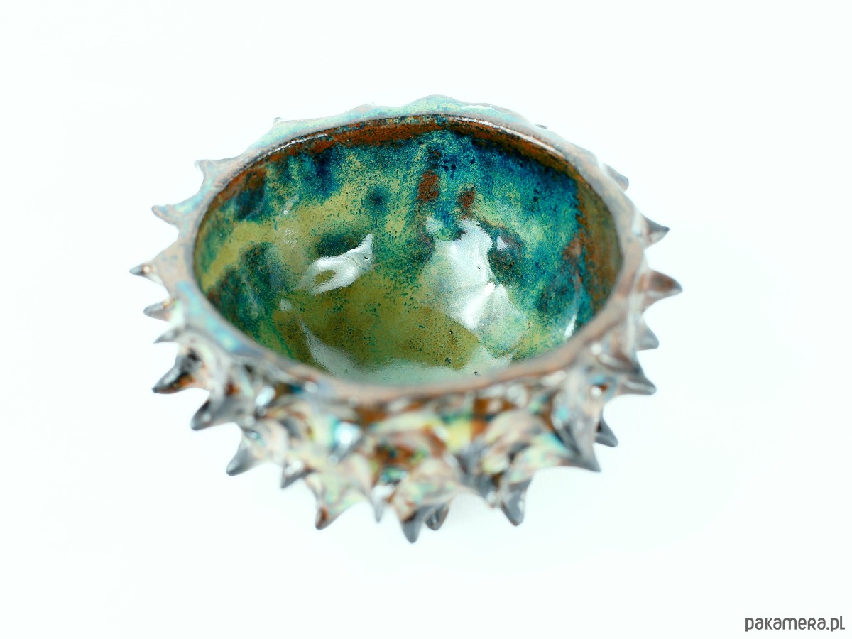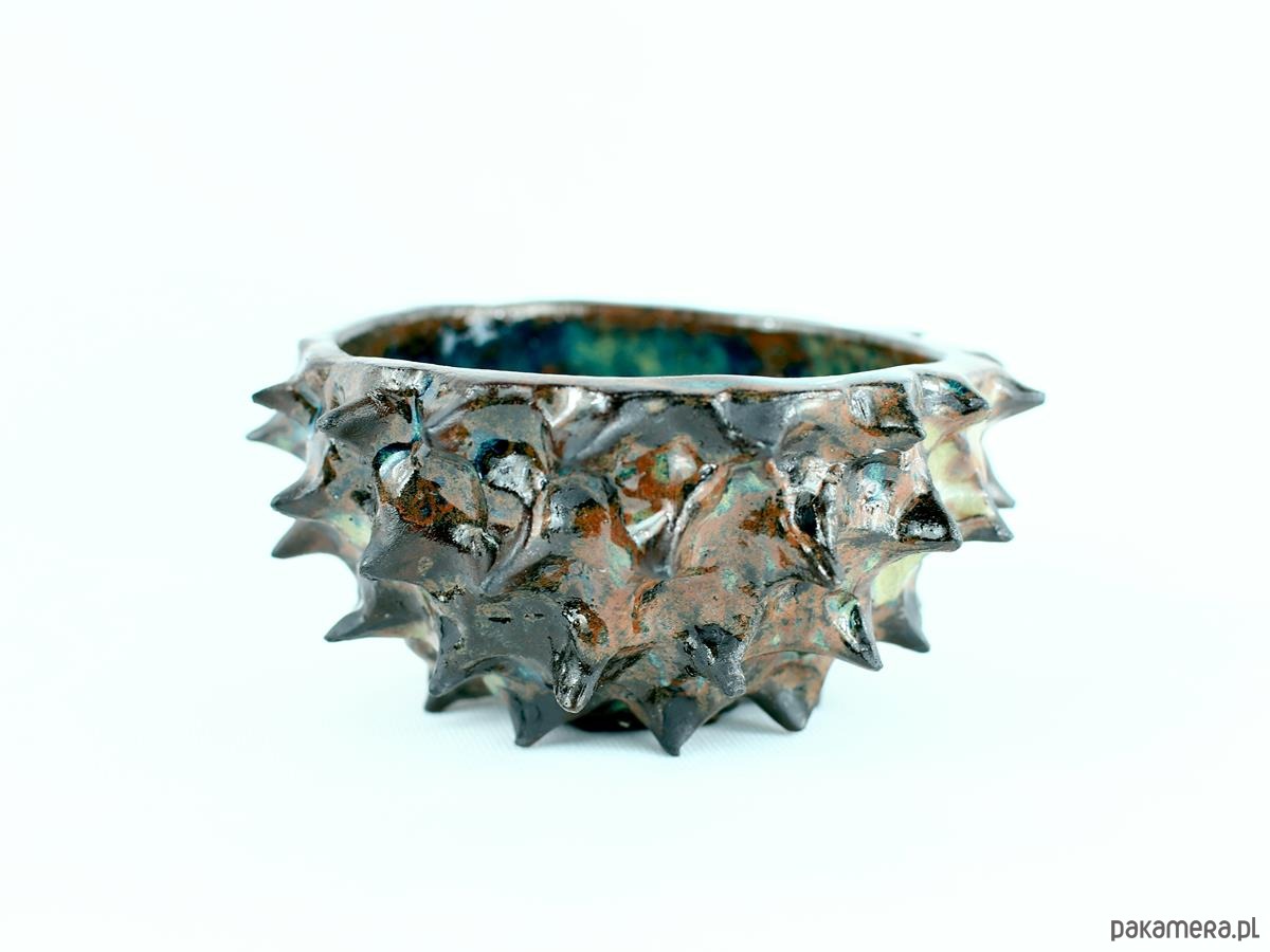 Ta miseczka to fascynujące połączenie surowości i elegancji. Na pierwszy rzut oka kojarzy się z czymś organicznym, co zostało wydobyte z głębin oceanu lub znalezione w lesie – przypomina skorupę kasztana. Powierzchnia jest usiana licznymi kolcami), które nadają jej piękny, drapieżny charakter. To naczynie, które aż prosi się o dotyk, mimo swojej pozornej niedostępności. Ta miseczka wygląda jak piękny symbol ochrony wewnętrznej wrażliwości. Jest piękna, ale ma kolce, które strzegą tego, co jest w środku.