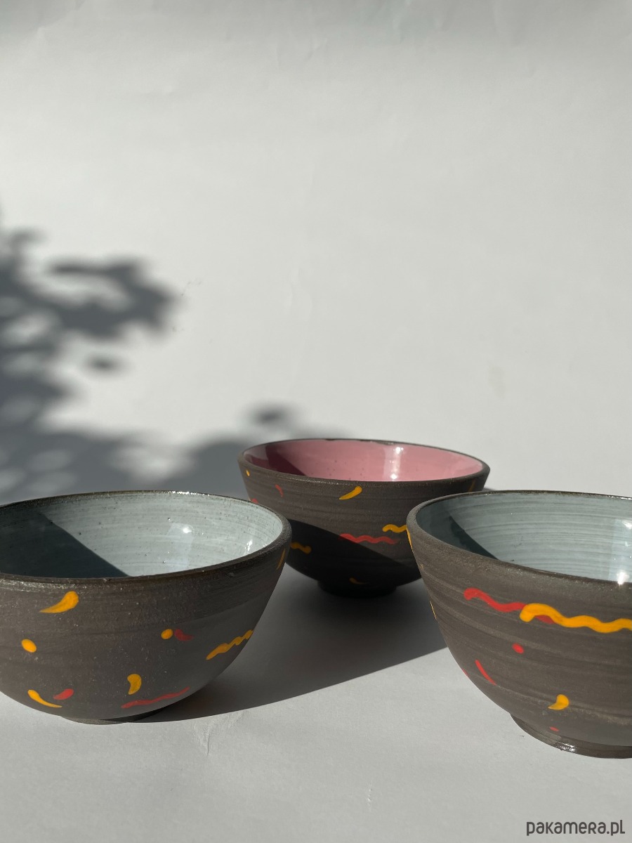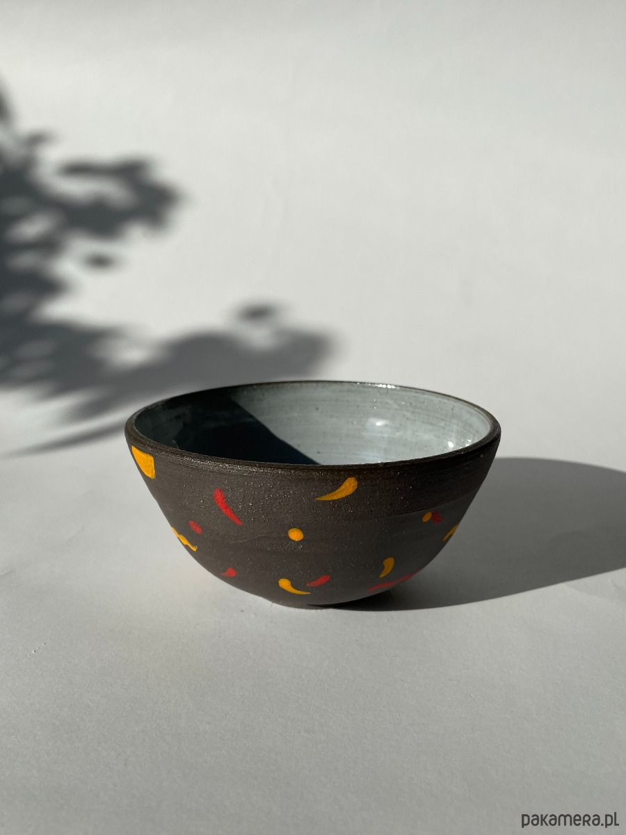 Wykonana z czarnej gliny przełamanej kolorowymi confetti. W środku poszkliwiona na fioletowo lub różowo.