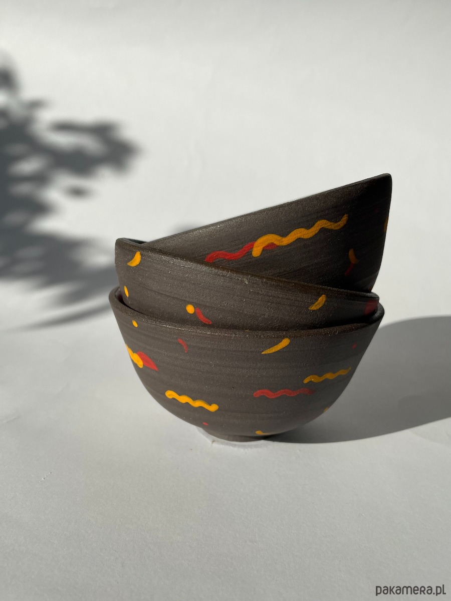 Wykonana z czarnej gliny przełamanej kolorowymi confetti. W środku poszkliwiona na fioletowo lub różowo.