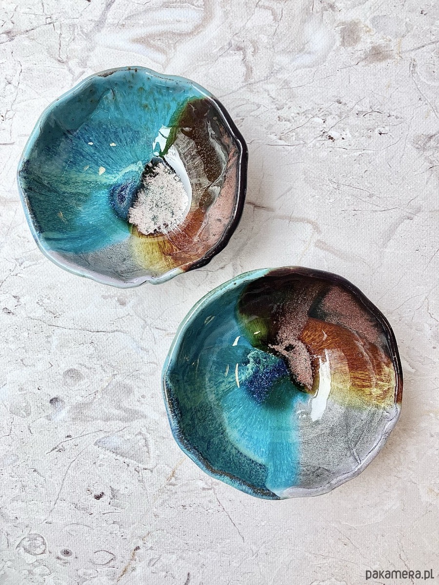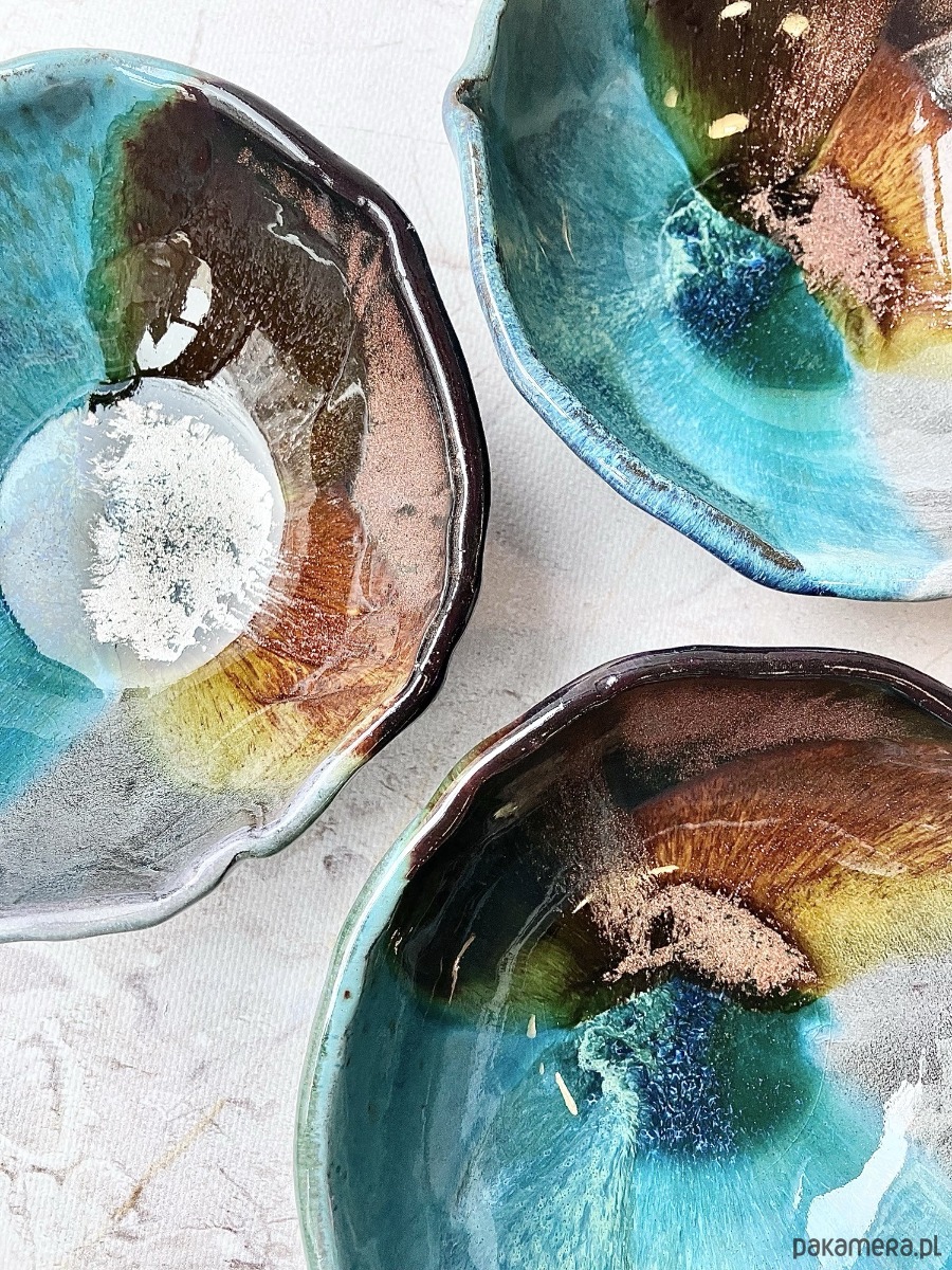 Miseczki GALAXY LAVENDER to unikatowe, ręcznie formowane naczynia inspirowane kolorystyką kosmicznych mgławic. Każda z nich ma organiczny, nieregularny kształt oraz szkliwo tworzące abstrakcyjne, malarskie przejścia kolorów- od głębokiego turkusu i morskich błękitów, przez ciepłe miodowe brązy, aż po subtelny, zgaszony fiolet.