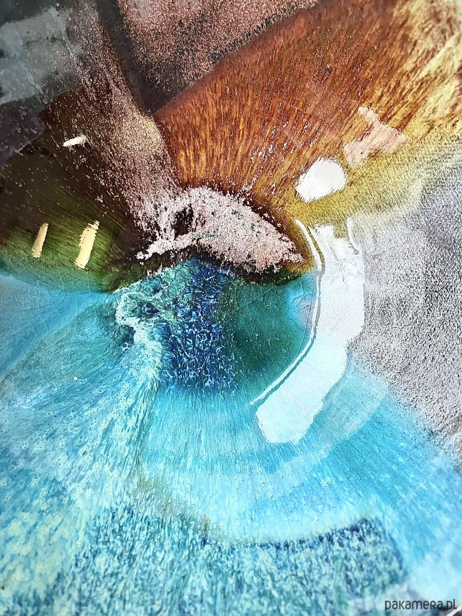Szkliwo układa się w efekty przypominające rozchodzące się fale światła, kosmiczne wiry i strukturę gwiezdnego pyłu. W niektórych miejscach powierzchnia jest lekko krystaliczna, dodając głębi i trójwymiarowości. Połysk szkliwa potęguje wrażenie "mokrego" efektu i sprawia, że kolory zmieniają się w zależności od światła.