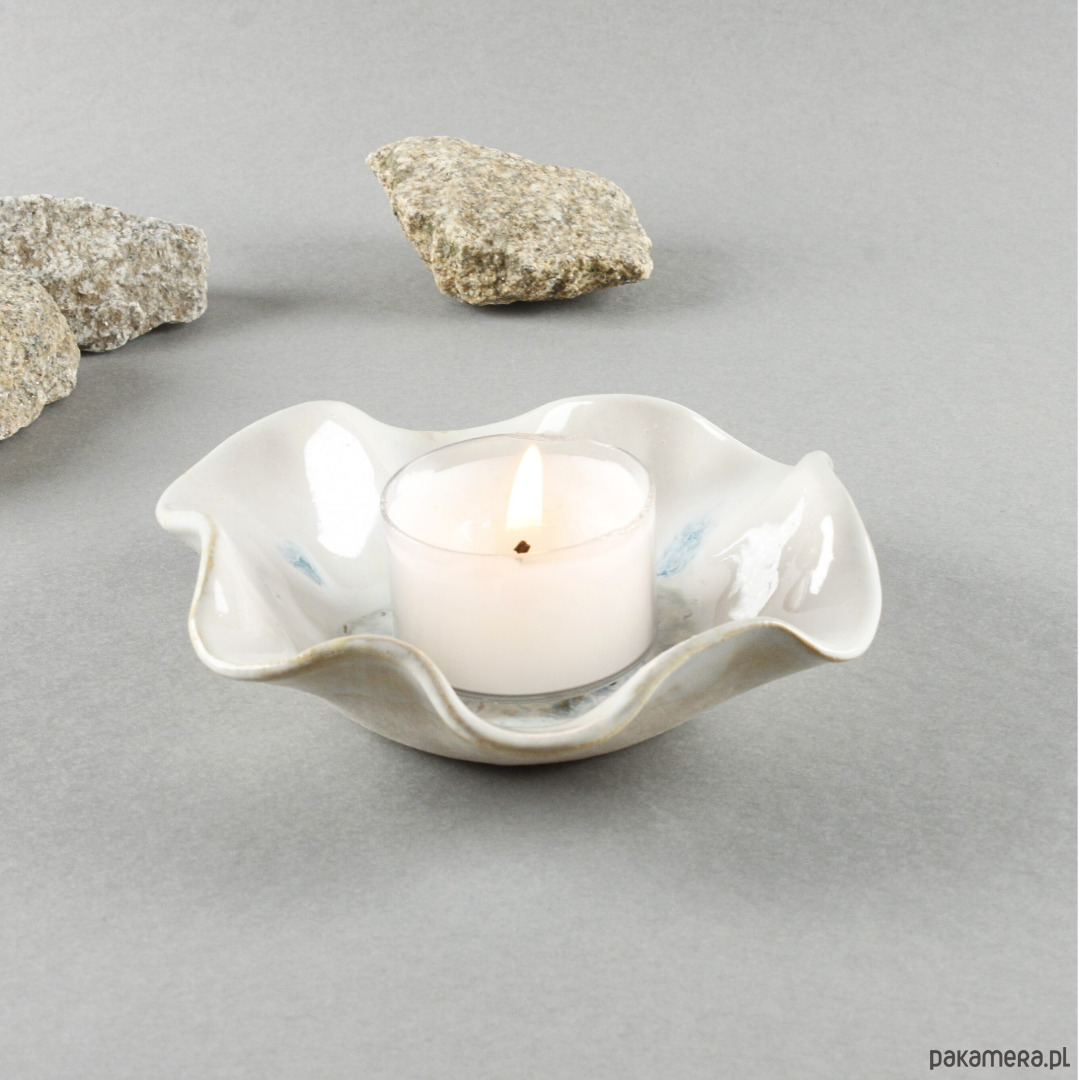 Ręcznie lepiona ceramiczna miseczka w kształcie kwiatka na biżuterię, świeczkę lub inne drobiazgi. Wykonana z jasnej gliny.