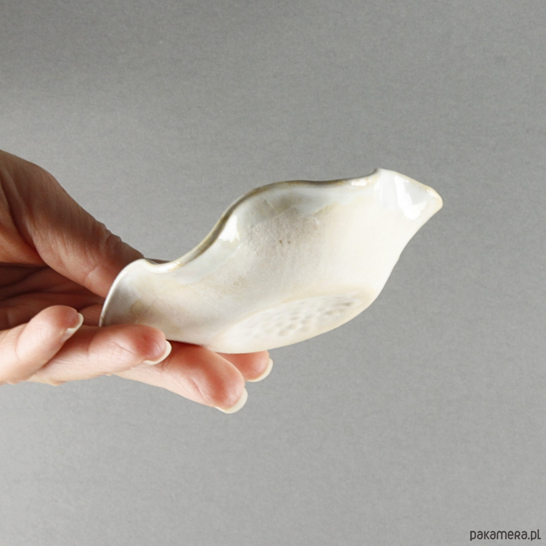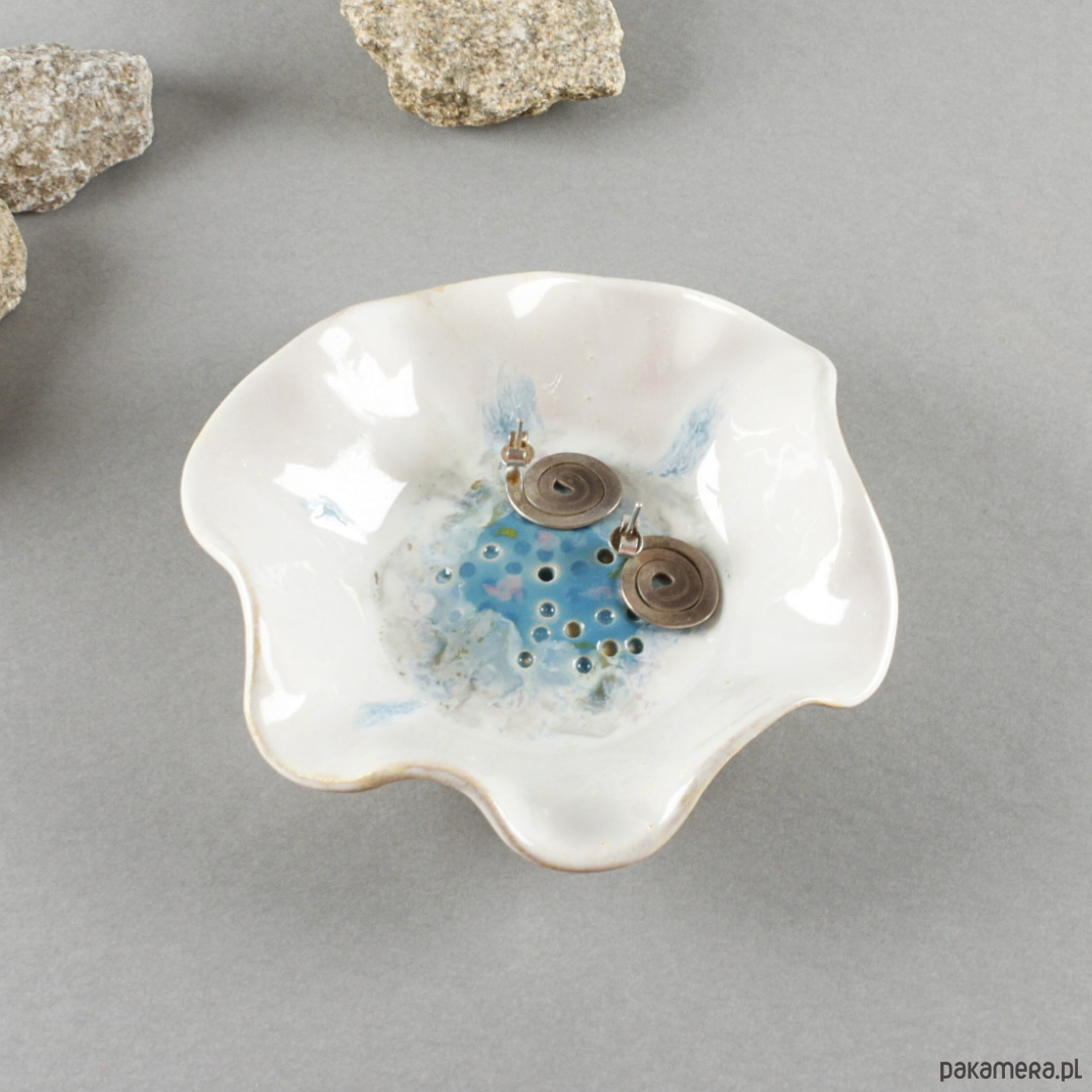 Ręcznie lepiona ceramiczna miseczka w kształcie kwiatka na biżuterię, świeczkę lub inne drobiazgi. Wykonana z jasnej gliny.