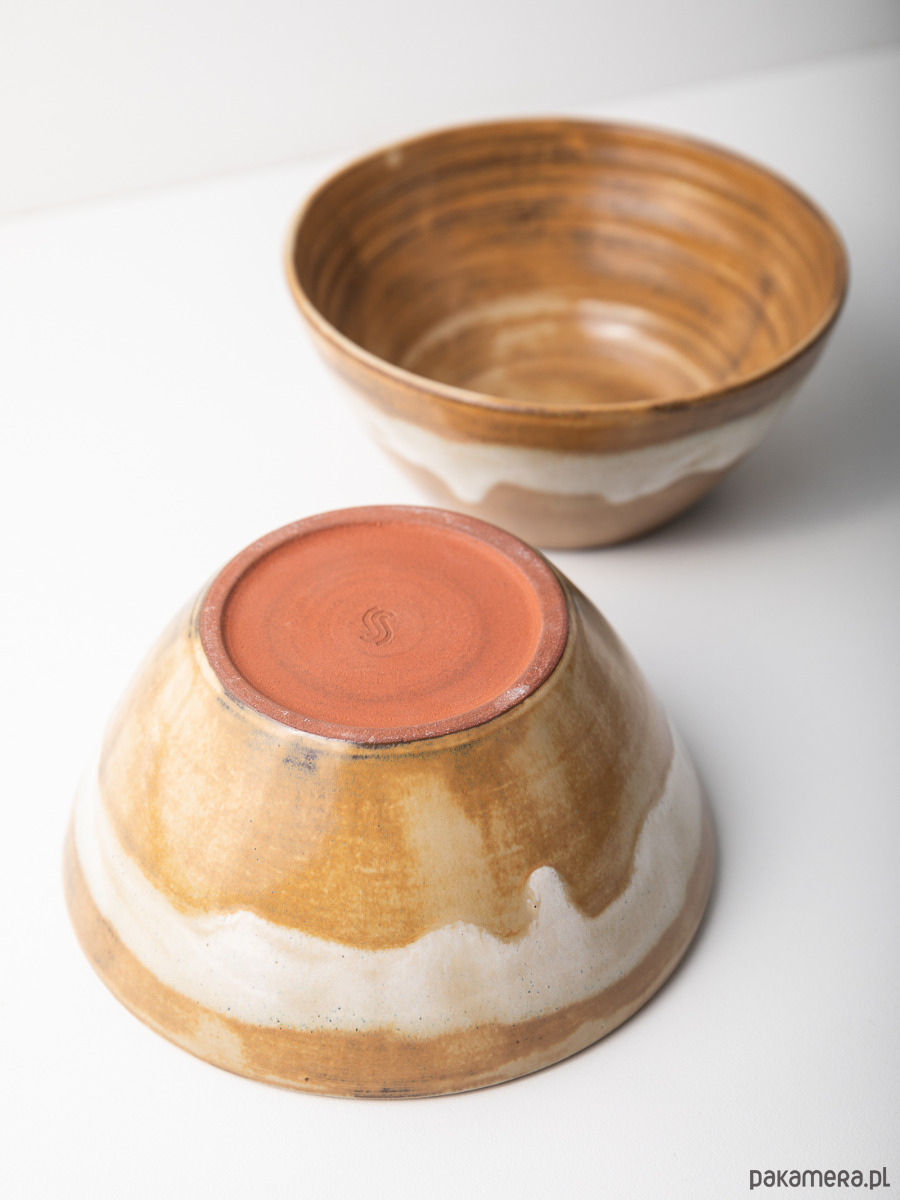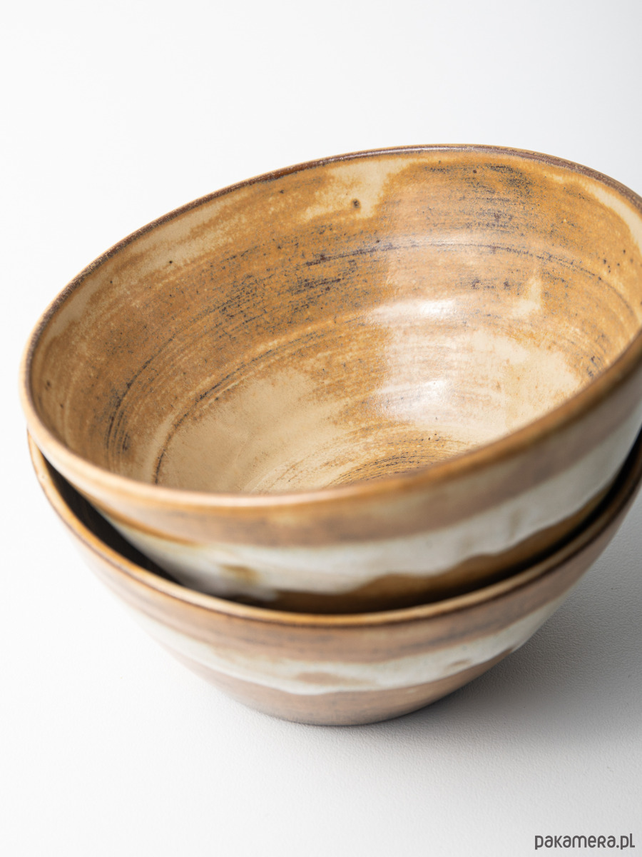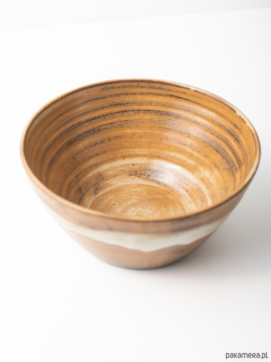 Powierzchnia pokryta szkliwem w naturalnej palecie: ciepłe brązy, beże i mleczna biel. Szkliwo układa się nieregularnie, z wyraźną linią spływu – każdy egzemplarz różni się detalami, co jest naturalnym efektem ręcznego procesu i wypału.