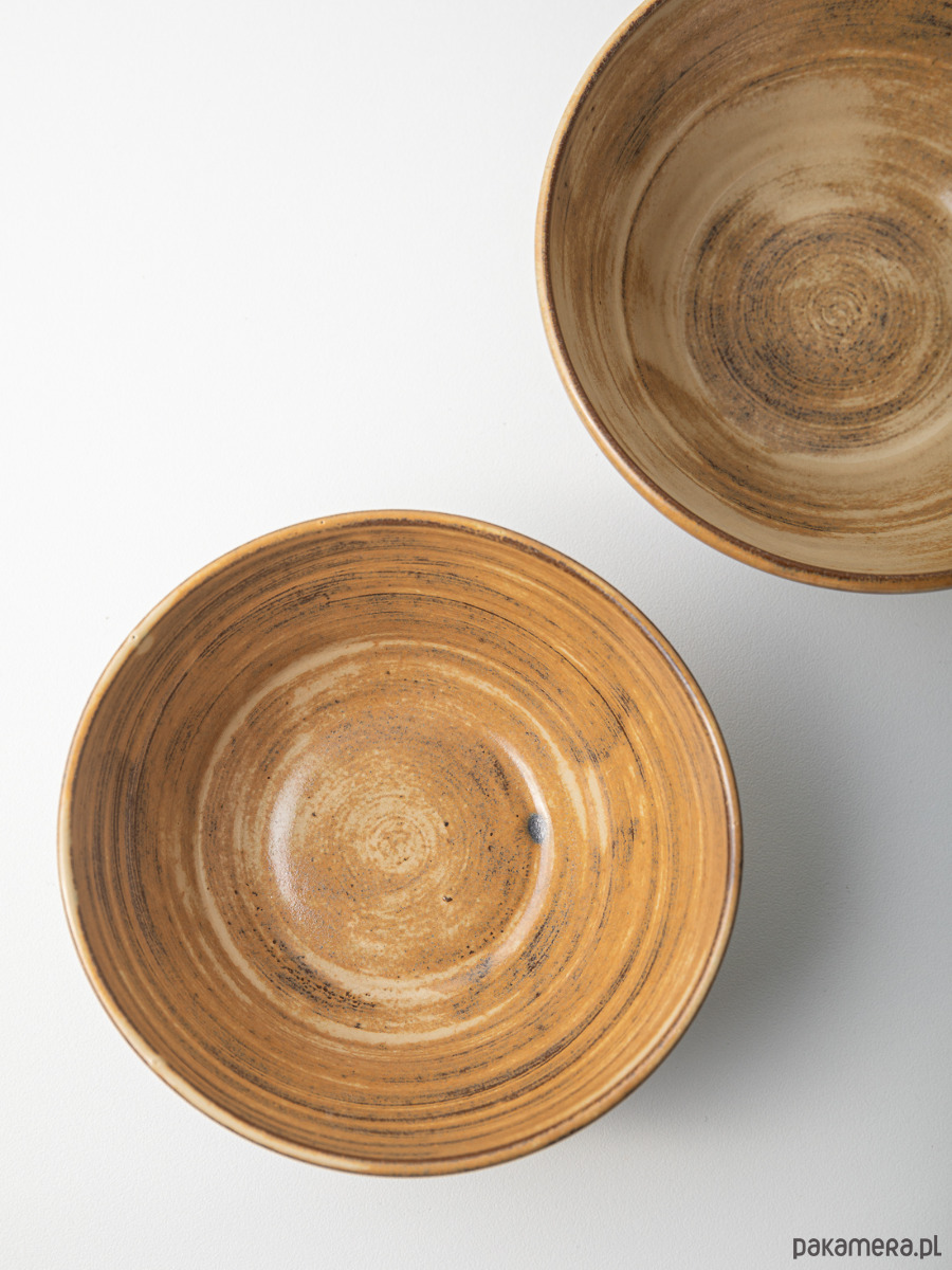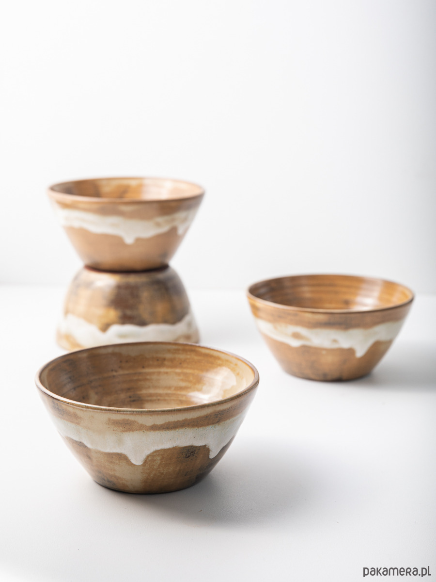 Niewielkie ceramiczne miseczki o prostej formie wykonane z brązowej gliny. Każdy egzemplarz wykonany na kole garncarskim, z widocznymi delikatnymi śladami toczenia wewnątrz, które nadają im nieco rustykalny charakter.