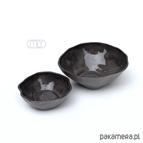 Komplet dwóch ceramicznych miseczek o unikatowym organicznym kształcie, wykonanych z delikatnej barwionej kamionki w kolorze ciemnografitowym, wewnątrz szkliwione błyszczącym szkliwem, przeznaczonym do kontaktu z żywnością, na zewnątrz delikatnie polerowane. Wymiary: ok. 6cm wysokości i 15cm i 10cm średnicy. Znakomite jako urozmaicenie codziennej ceramiki stołowej. Polecam
