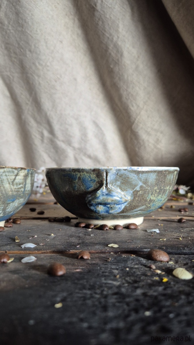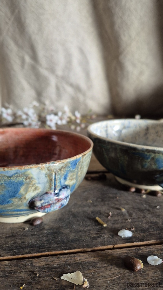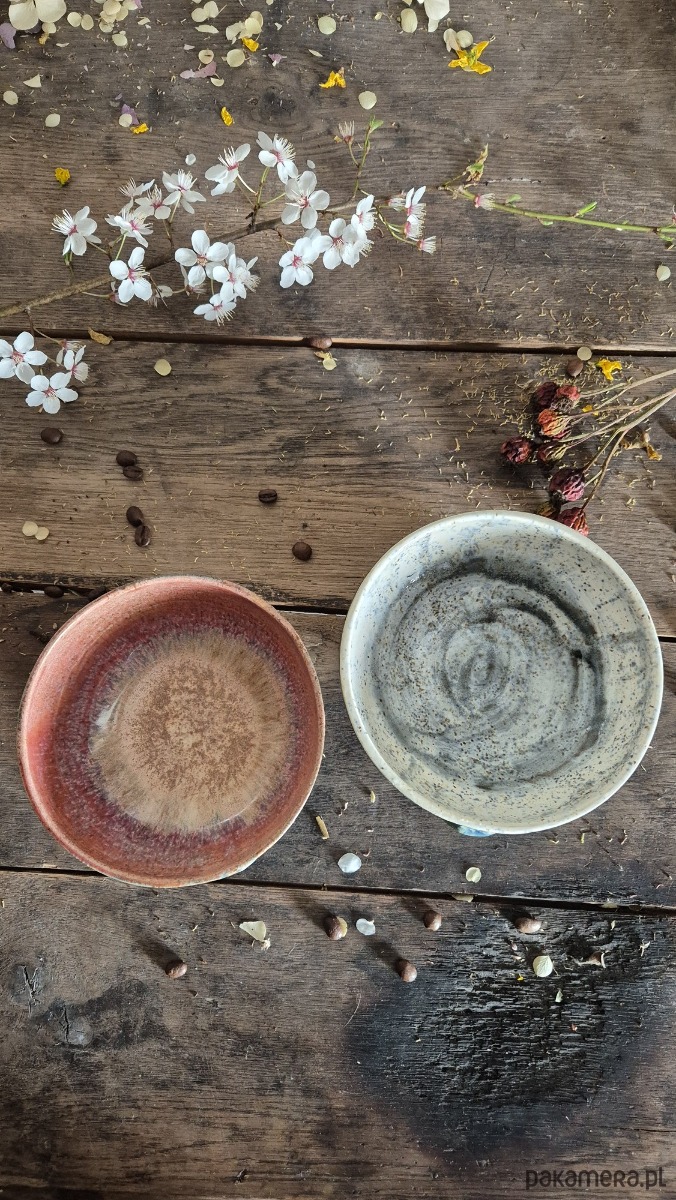 Toczone na kole miseczki na owsiankę, średnica 13 cm. Rzeźbione recznie usta.