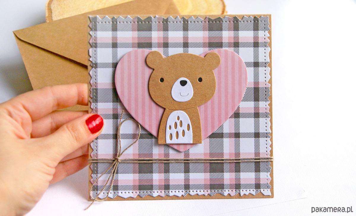 urocza kartka z okazji narodzin bobasa/ chrztu lub urodzinek - wykonana na bazie kartonu eko-kraft (100% makulatury), ozdobiona wzorzystym kartonem z ozdobnymi przeszyciami na krawędziach (lub fakturowanym przeze mnie kartonem - w zależności od modelu); na środku zamocowany duży, przestrzenny element z przesłodkim misiem. Miś jest wykonany z różnego rodzaju papierów - NIE drukowany.