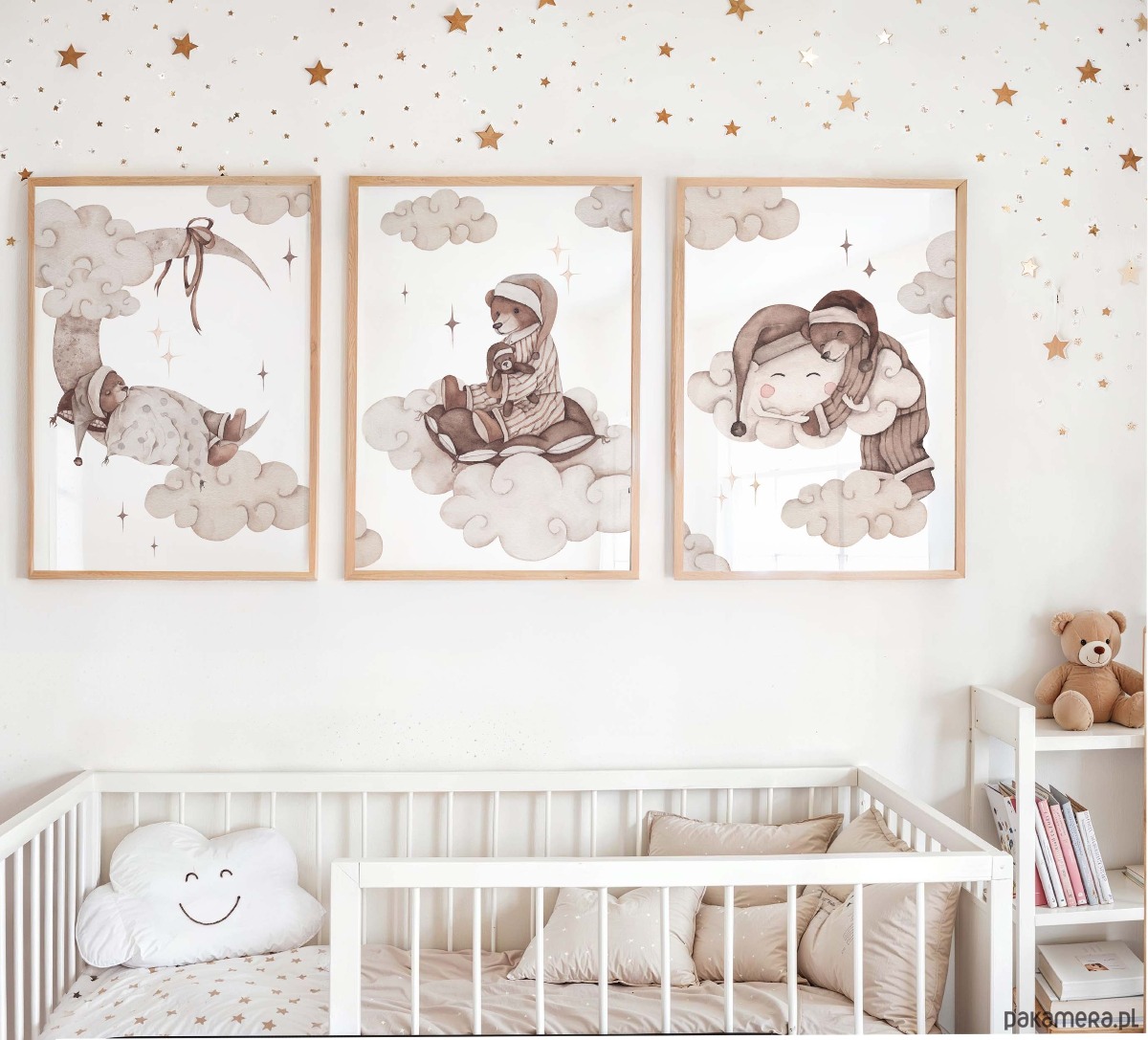 Zestaw Misie Sleepy Teddy to wyjątkowa kolekcja trzech plakatów w delikatnych odcieniach beżu i brązu, idealna do pokoju dziecka w stylu boho lub vintage.