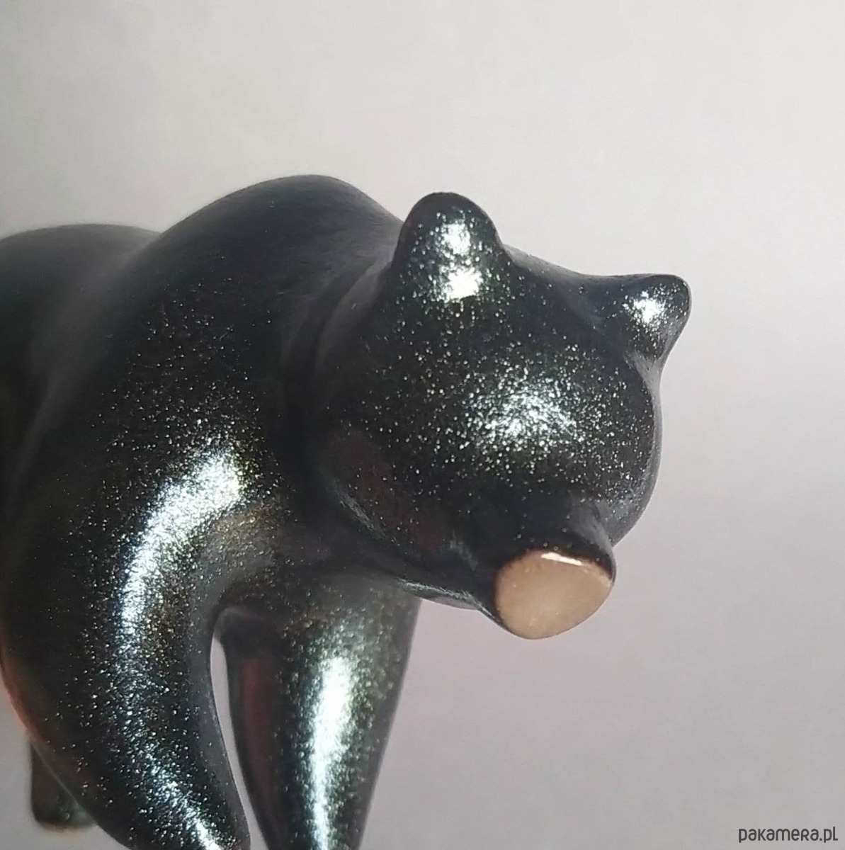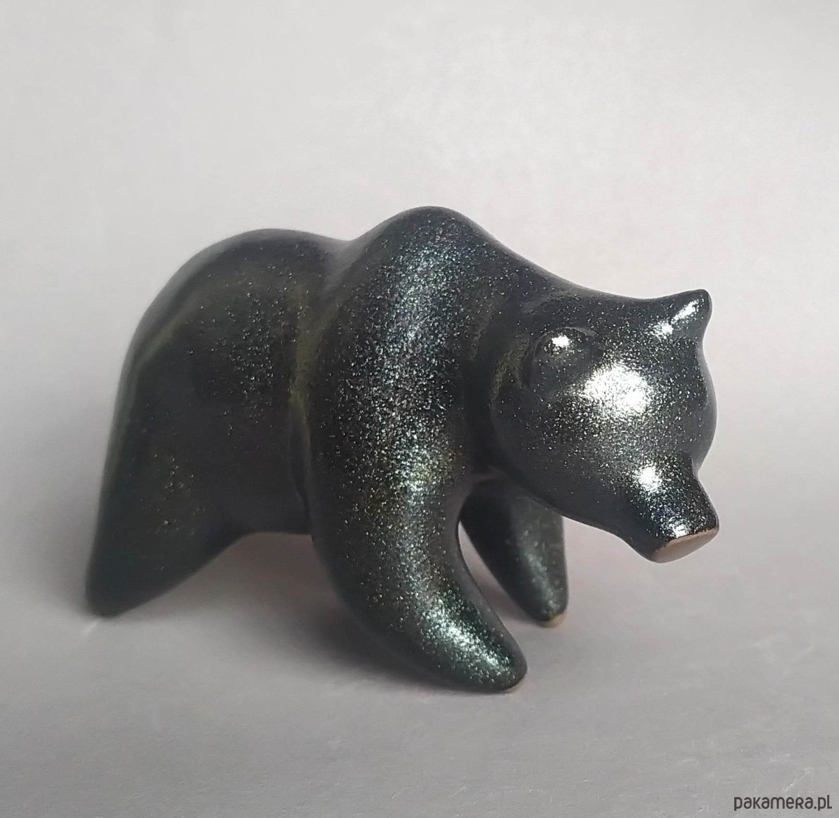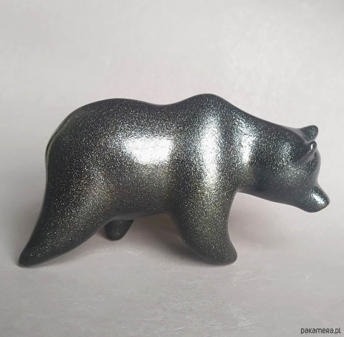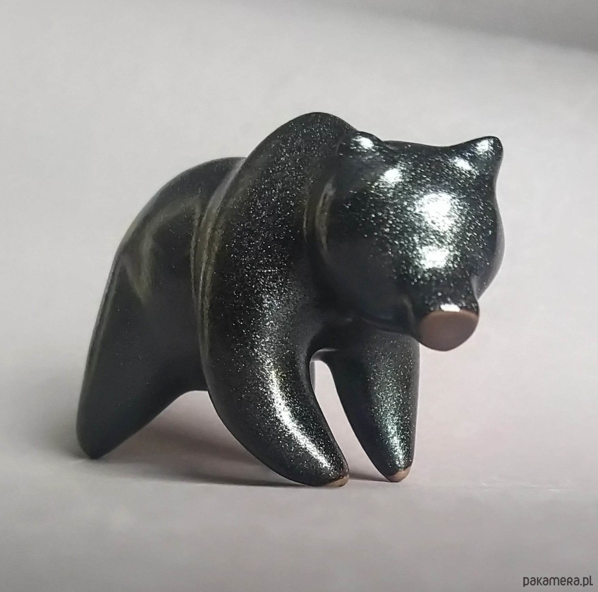 Ceramiczna figurka niedźwiedzia, wykonana z mocno spieczonej barwionej kamionki, pokryta ciemnobrązowym szkliwem o połyskujących drobinkach, długość około 11,5cm. Świetnie się prezentuje w stadzie