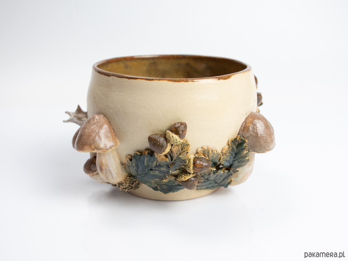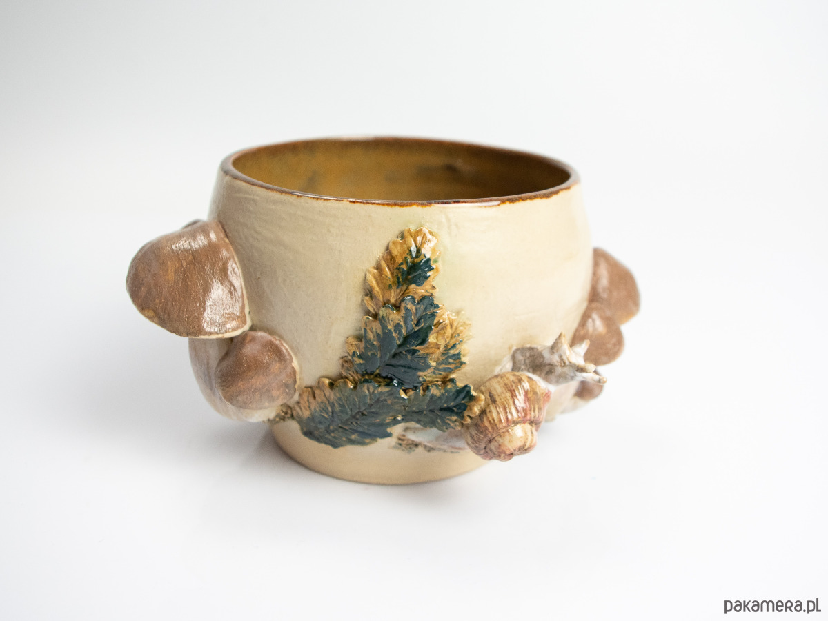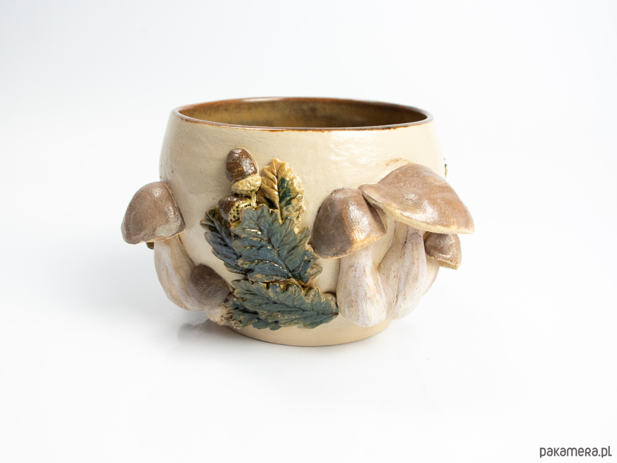 Miska „Borowiki” została wykonana ręcznie: bazę uformowano na kole garncarskim, a następnie ozdobiono ją plastycznymi rzeźbieniami borowików, liści dębu oraz filigranowego ślimaka, które tworzą dookoła naczynia leśną miniaturę. Wnętrze miski pokryte jest szkliwem w ciepłym, miodowo‑brązowym odcieniu, harmonizującym z kremowym kolorem gliny i naturalnymi barwami grzybów oraz liści. Zewnętrzna powierzchnia zabezpieczona jest przezroczystym szkliwem, które podkreśla fakturę ręcznego modelowania i dodaje całości subtelnego połysku. Miska jest niepowtarzalna, inspirowana lasem, znakomicie sprawdzi się zarówno na stole, jak i jako wyjątkowy, przyrodniczy akcent dekoracyjny lub prezent dla miłośników natury.